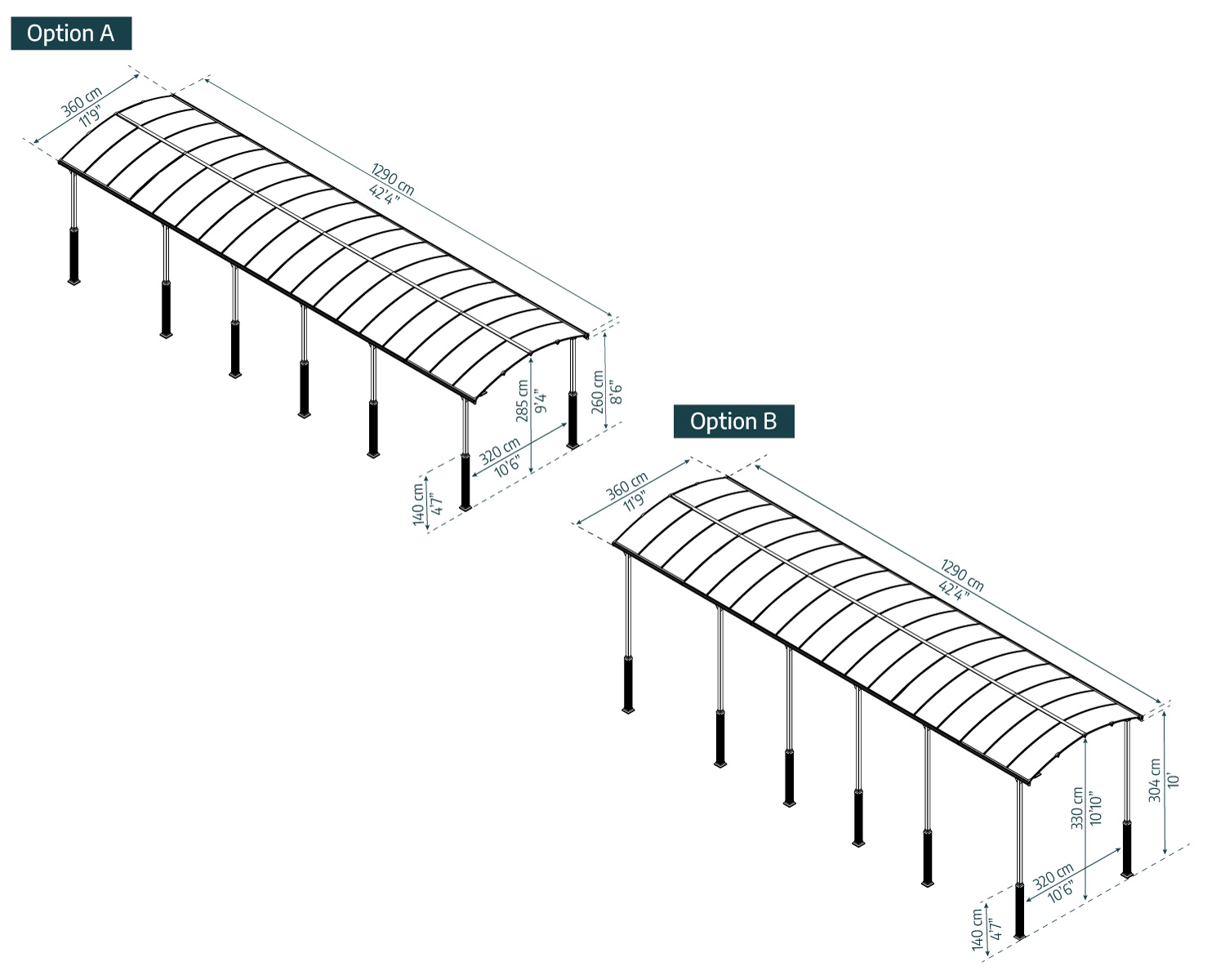 - Die maximale Höhe des Carports beträgt 11’7″ (352 cm).