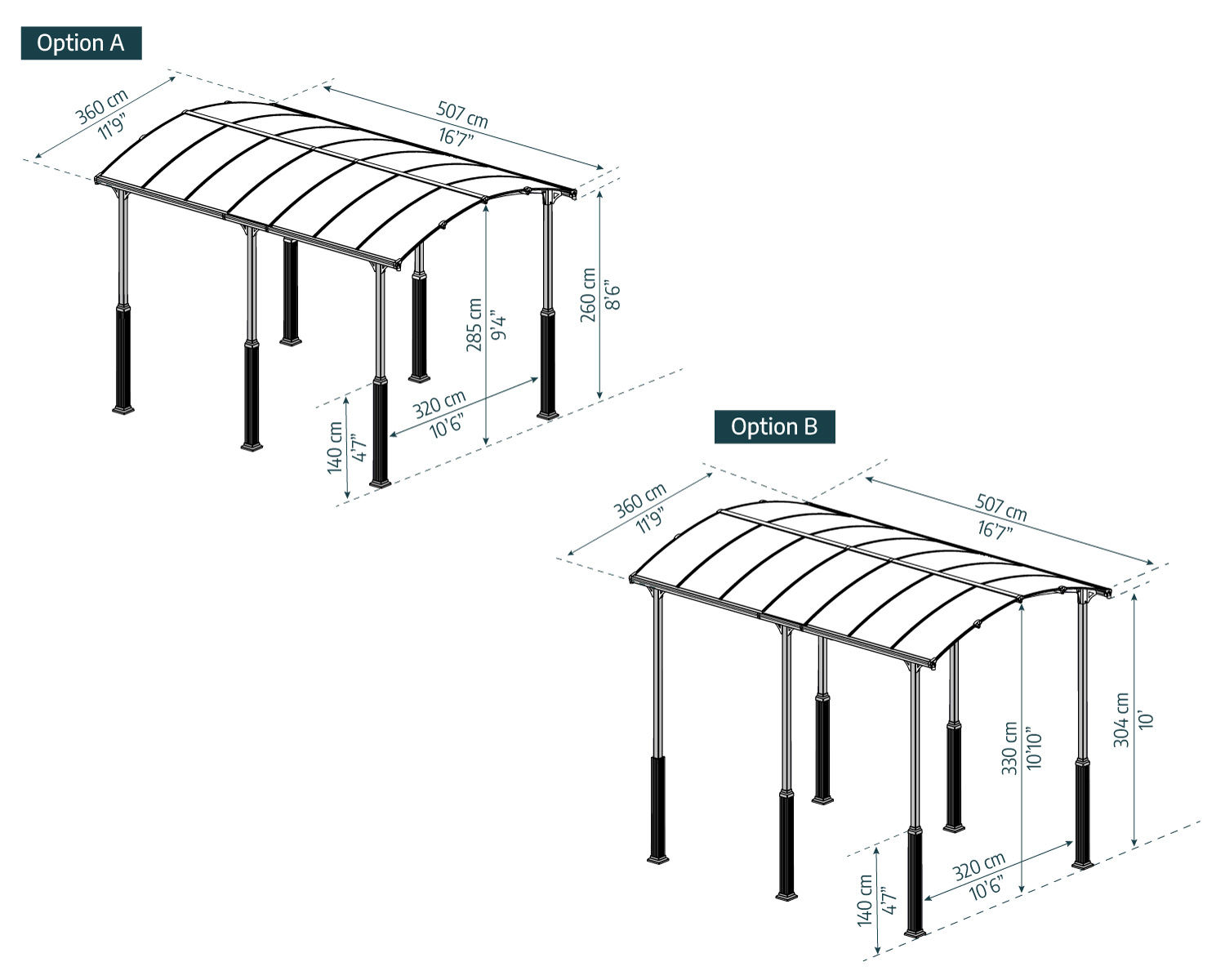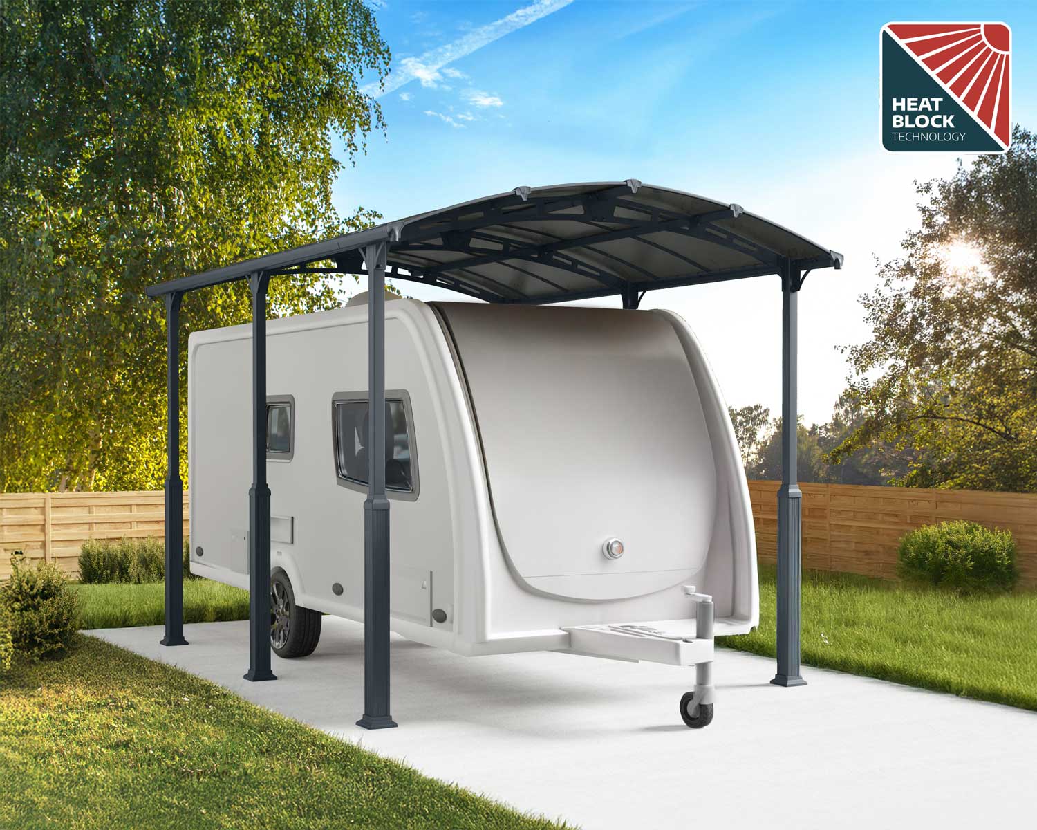 Haben Sie ein Wohnmobil oder ein Boot, das Sie vor Sonne und Schnee schützen möchten? Wir haben das Richtige für Sie. Der Alpine Wohnmobil- und Bootscarport ist eine hochwertige, langlebige Konstruktion, die den Einflüssen des Wetters standhält und Ihr Fahrzeug oder Boot zuverlässig schützt. Der hohe DIY-Carport ist höhenverstellbar und passt sich all Ihren Bedürfnissen an, auch wenn diese sich im Laufe der Jahre ändern. Der Aluminium-Carport schützt die Lackierung Ihres Fahrzeugs vor dem Ausbleichen durch die Sonne und vor unnötigen Kratzern und Schäden. Mit über 10 Fuß (3 m) Einfahrtsbreite und 7 Fuß (2,13 m) Deckenhöhe bietet der Alpine RV Carport viel Platz zum Parken und um Ihr Fahrzeug zu begehen. Dieser stabile Einzelcarport verfügt außerdem über eine Schneelastkapazität von bis zu 20.5 lbs/sq ft (100 kg/m2). Zu den weiteren Eigenschaften gehören eine Regenrinne zur Ableitung des Regenwassers, doppelwandige Dachplatten aus Polycarbonat und ein pulverbeschichteter Rahmen aus Aluminium und verzinktem rostfreiem Stahl. Verlängern Sie die Lebensdauer Ihres Bootes oder Wohnmobils mit dem Alpine Carport Bausatz.