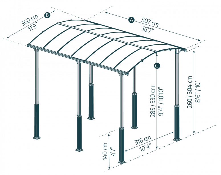 • Die maximale Höhe des Carports beträgt 11’7″ (352 cm).