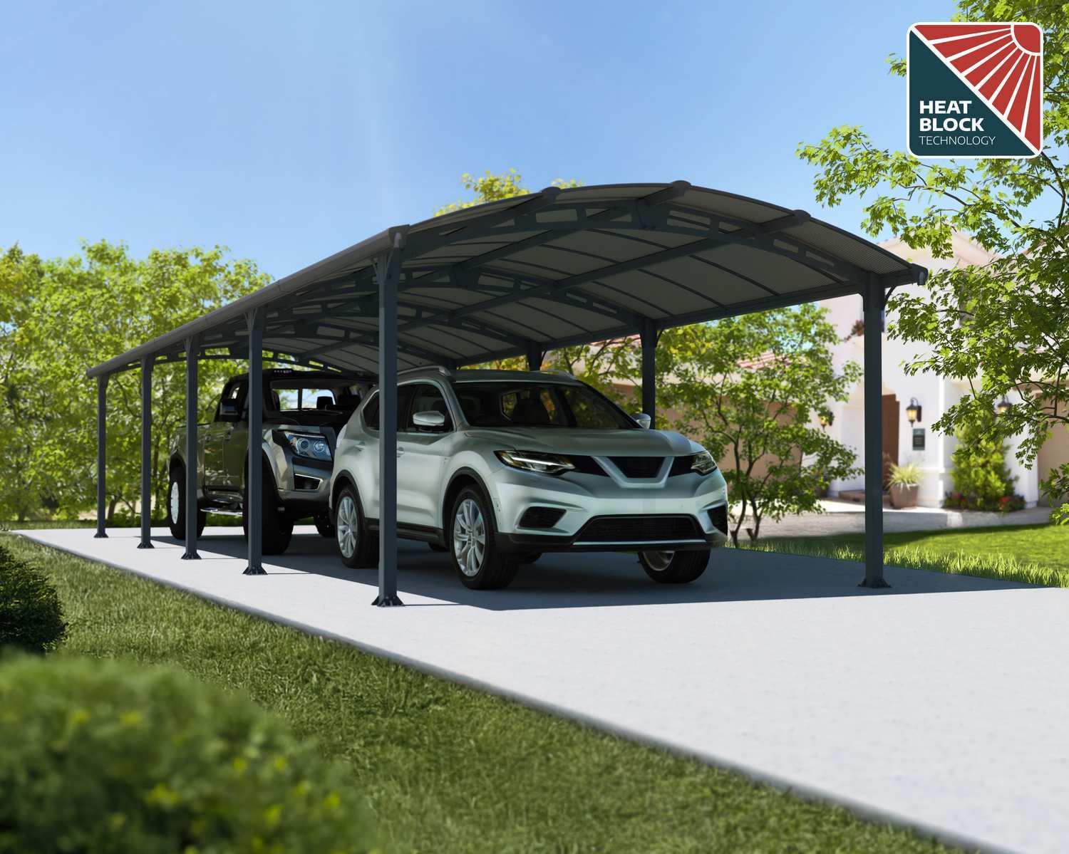 Wer kennt sie nicht, die Morgen, an denen man bei schlechtem Wetter sein Auto vom Schnee befreien oder in ein glühend heißes Fahrzeug steigen muss. Der Arcadia Carport spart Ihnen Zeit und Mühe und schützt Sie und Ihr Auto vor dem Wetter. Der Carport-Bausatz mit gewölbtem Dach verfügt über Paneele. aber dennoch UV-Schutz und vollen Schatten bieten und unnötige Kratzer und Schäden vermeiden. Mit einer Einfahrtsbreite von 325 cm und einer lichten Höhe von 219 cm bietet Ihnen der robuste Arcadia-Carport viel Platz zum Parken und Begehen Ihres Fahrzeugs. Zu den weiteren Merkmalen gehören eine Regenrinne zur Ableitung des Regenwassers, doppelwandige Polycarbonat-Dachplatten mit hoher Schlagfestigkeit und ein rostbeständiger Aluminiumrahmen. Dank all dieser Merkmale ist die Konstruktion vielseitig einsetzbar und kann auch als überdachter Aufenthaltsbereich im Freien genutzt werden. Dank der einzigartigen Heat Block Technology“ verhindert die Vollschattenverglasung das Durchscheinen der Sonnenstrahlen und sorgt so für ein noch angenehmeres Outdoor-Erlebnis. Verlängern Sie die Lebensdauer Ihres Fahrzeugs und verbringen Sie weniger Zeit damit, sich um Ihr Auto zu kümmern – mit dem Arcadia Carport Kit.