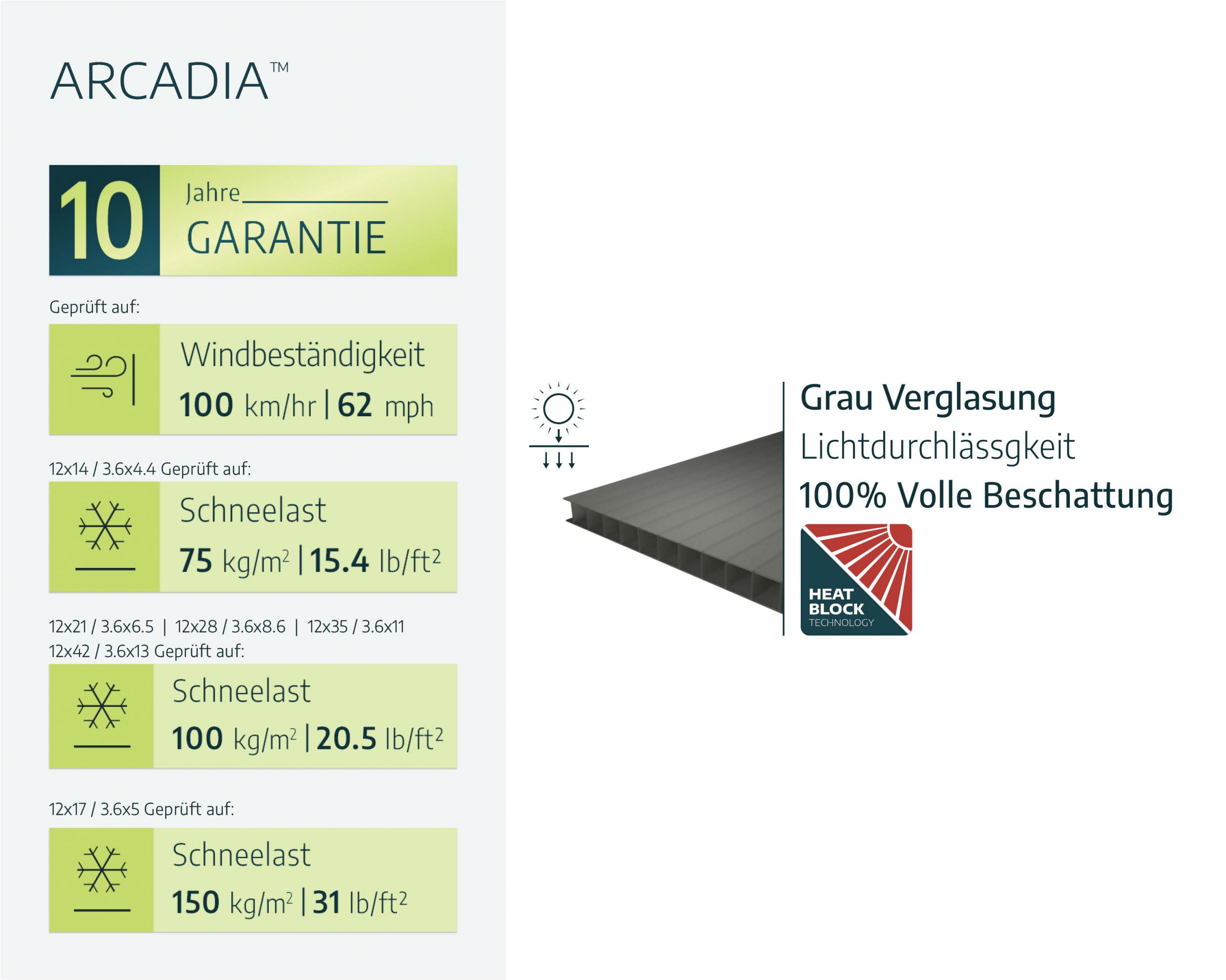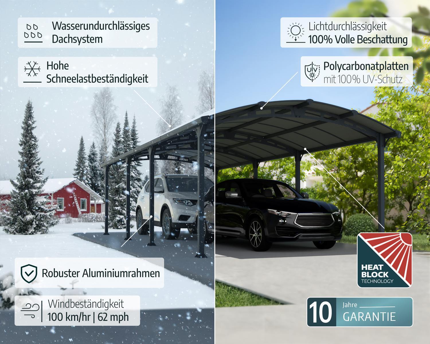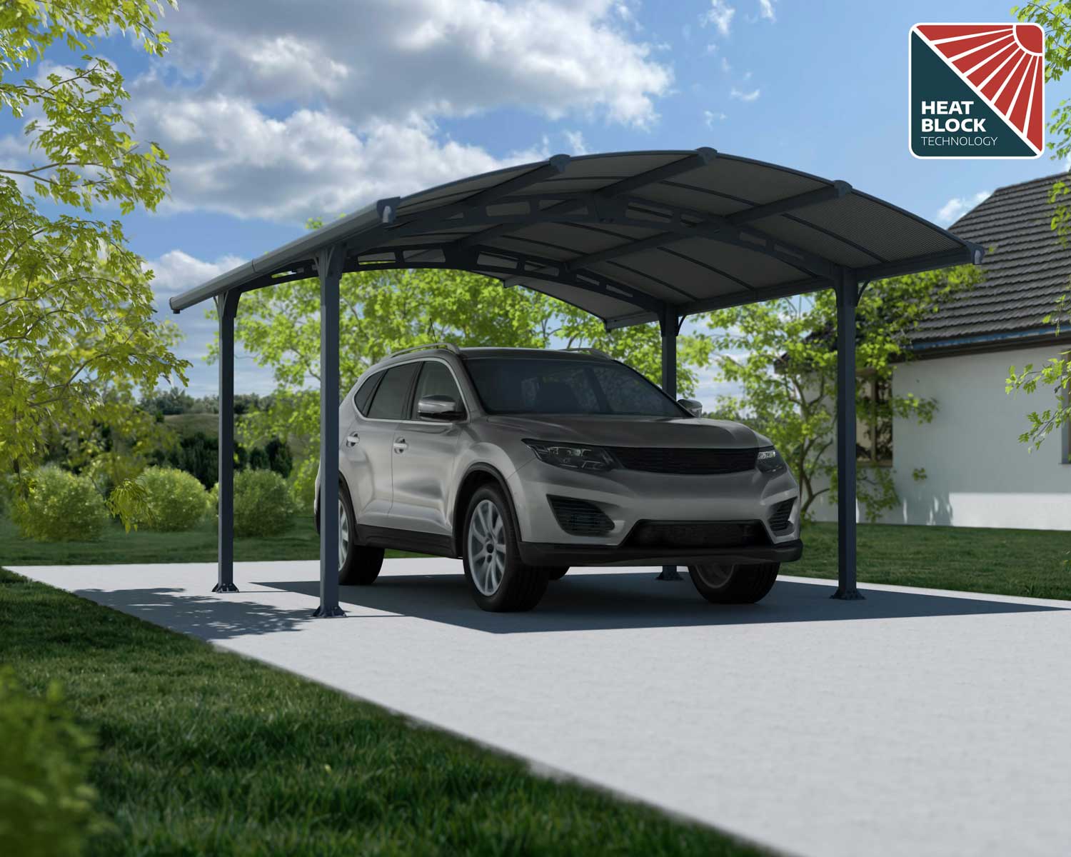 Wer kennt sie nicht, die Morgen, an denen man bei schlechtem Wetter sein Auto vom Schnee befreien oder in ein glühend heißes Fahrzeug steigen muss. Der Arcadia Carport spart Ihnen Zeit und Mühe und schützt Sie und Ihr Auto vor dem Wetter. Der Carport-Bausatz mit gewölbtem Dach verfügt über Paneele. aber dennoch UV-Schutz und vollen Schatten bieten und unnötige Kratzer und Schäden vermeiden. Mit einer Einfahrtsbreite von 325 cm und einer lichten Höhe von 219 cm bietet Ihnen der robuste Arcadia-Carport viel Platz zum Parken und Begehen Ihres Fahrzeugs. Zu den weiteren Merkmalen gehören eine Regenrinne zur Ableitung des Regenwassers, doppelwandige Polycarbonat-Dachplatten mit hoher Schlagfestigkeit und ein rostbeständiger Aluminiumrahmen. Dank all dieser Merkmale ist die Konstruktion vielseitig einsetzbar und kann auch als überdachter Aufenthaltsbereich im Freien genutzt werden. Dank der einzigartigen Heat Block Technology“ verhindert die Vollschattenverglasung das Durchscheinen der Sonnenstrahlen und sorgt so für ein noch angenehmeres Outdoor-Erlebnis. Verlängern Sie die Lebensdauer Ihres Fahrzeugs und verbringen Sie weniger Zeit damit, sich um Ihr Auto zu kümmern – mit dem Arcadia Carport Kit.