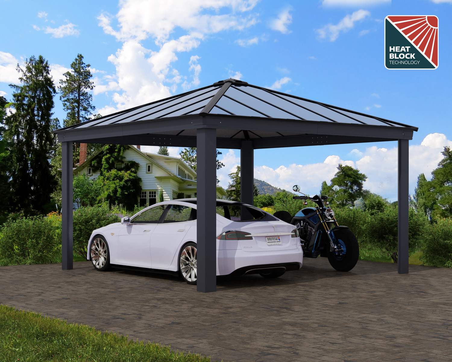 Fahren Sie in Ihre Einfahrt und parken Sie Ihre Autos sicher und stilvoll mit dem extrabreiten Carport Colorado. Dieser Carport-Bausatz aus Aluminium bietet Ihnen einen überdachten Parkplatz, um Ihre Fahrzeuge vor den Elementen zu schützen, und hat lediglich 4 Pfosten und einen breiten Eingang, in den bequem zwei große Autos passen. Fahrzeuge sind kostbar und es ist wichtig, teure Reparaturen zu vermeiden und Ihre Fahrzeuge vor Regen, Schnee und UV-Strahlen zu schützen. Die mattgrauen Polycarbonat-Dachplatten sind das ganze Jahr über witterungsbeständig und bieten vollen Schatten, um Ihr Auto kühl zu halten, den Lack zu schonen und Ihnen die Gewissheit zu geben, dass Ihre Fahrzeuge vor den Elementen geschützt sind. Der visuelle Kontrast zwischen dem robusten Aluminiumrahmen und dem Giebeldach verleiht Ihrem Außenbereich eine schlichte und moderne Note. Mit vorgebohrten Profilen und vorgeschnittenen Paneelen ist dieser große Carport-Bausatz montagefertig und einfach zu installieren. Mit dem Colorado-Carport aus Metall verleihen Sie Ihrem Haus einen besonderen Charme und schützen Ihr Fahrzeug über Jahre hinweg.