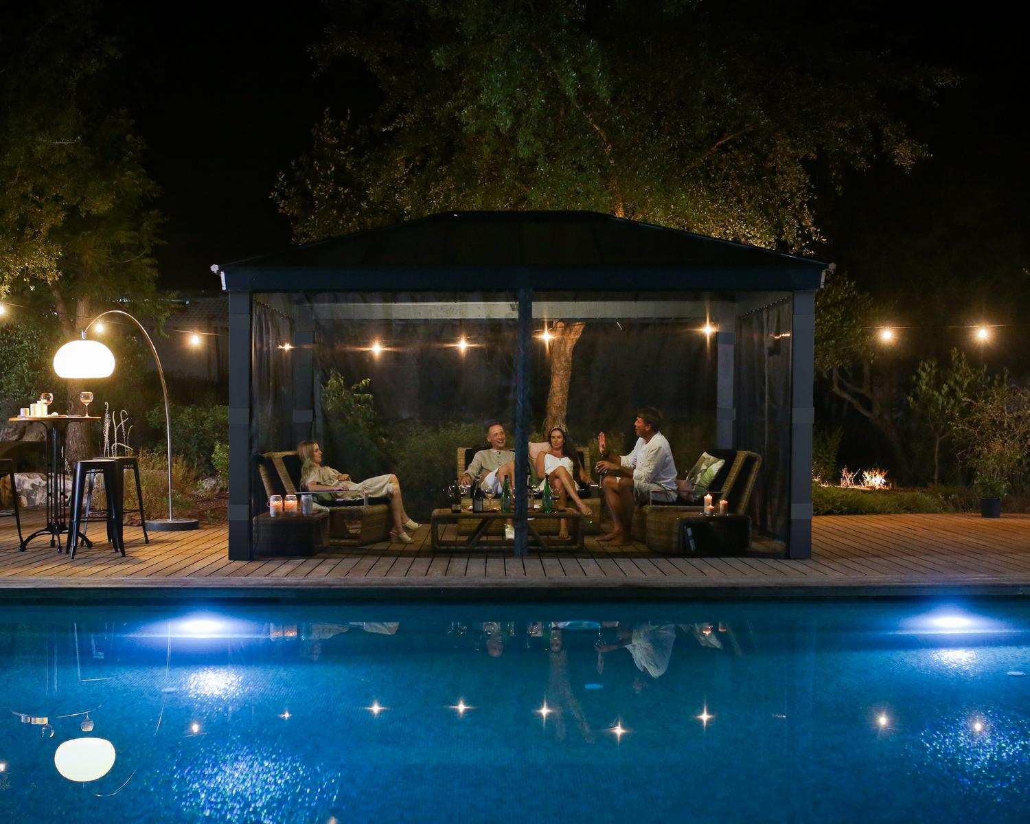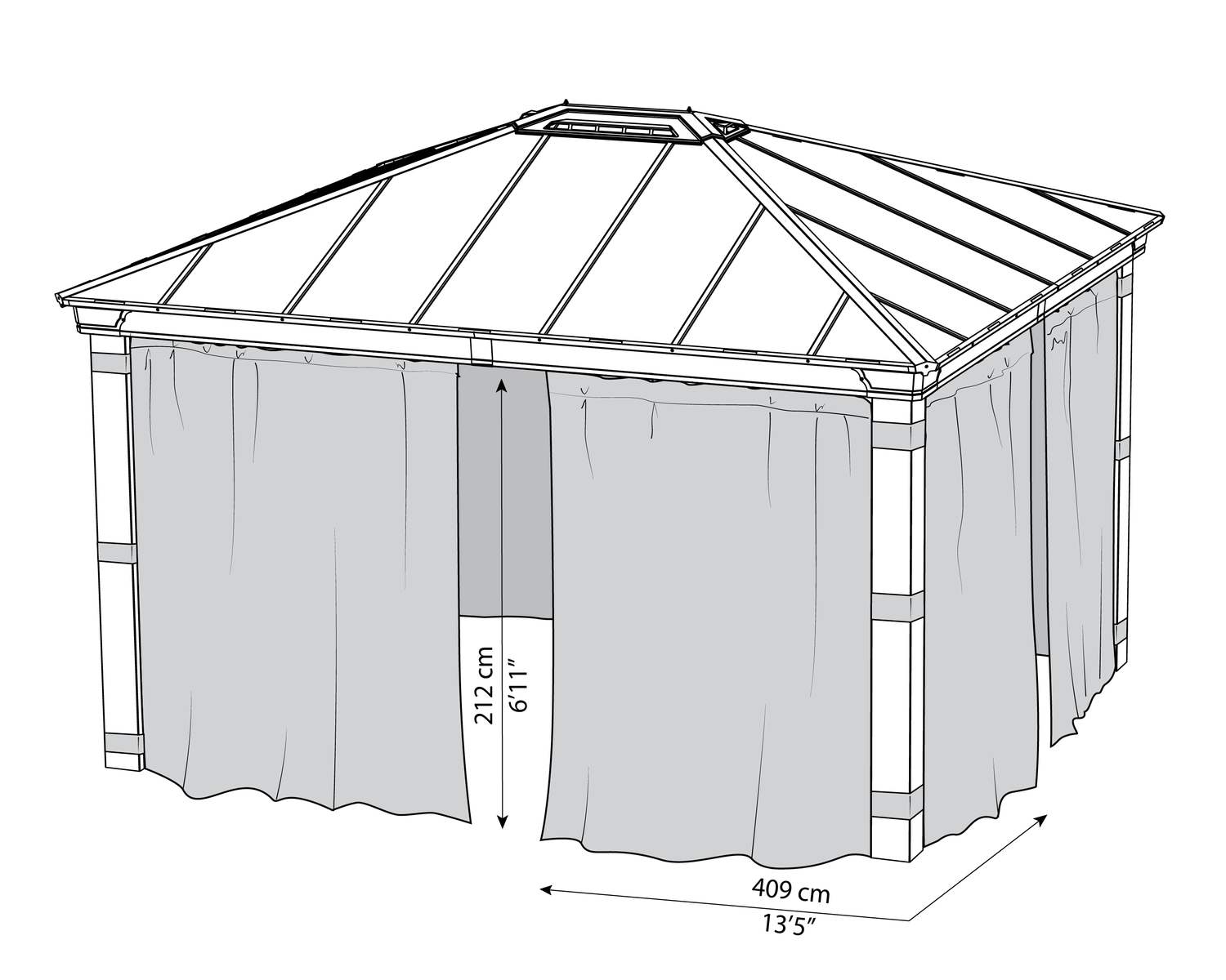 - Versteckte Haken, die sich leicht einklipsen lassen und frei entlang der Schienenkonstruktion des Pavillons verlaufen.