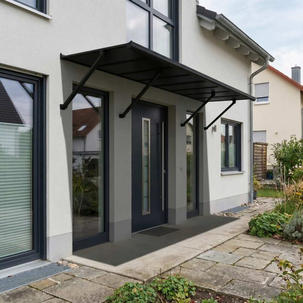 Das Canopia Augustine Türvordach vereint zeitlose Eleganz mit dauerhafter Stärke, um Ihren Eingangsbereich stilvoll zu schützen. Der markante schwarze Aluminiumrahmen, opake graue Doppelstegplatten und präzisionsgefertigte Stahlstützen bieten zuverlässigen Schutz das ganze Jahr über – und verleihen Ihrem Zuhause gleichzeitig einen modernen Look. Dank des flexiblen, verstellbaren Halterungssystems lässt sich das Augustine optimal positionieren – mit einem Abstand von 25 bis 50 cm über Ihrer Tür. Entwickelt, um Windgeschwindigkeiten bis 120 km/h und Schneelasten bis 120 kg/m² standzuhalten, schützt es Türen, Fenster oder Klimageräte zuverlässig vor Regen, Schnee, Hagel und intensiver Sonne. Ideal für Eingangs-, Seiten- und Hintertüren sowie Fenster und Garagen – das Augustine sorgt für einen trockenen, hellen und einladenden Eingangsbereich. Canopia Augustine – Langlebig. Wartungsfrei. Stilvoller Schutz für jede Jahreszeit.