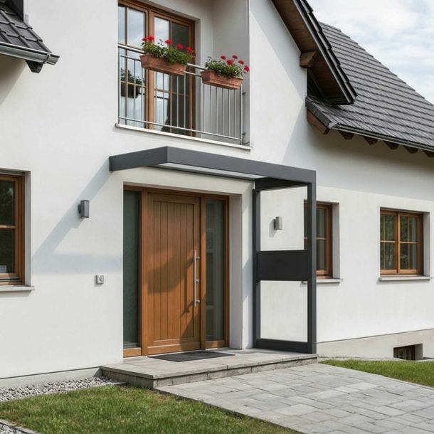Verleihen Sie Ihrem Eingangsbereich modernen Stil und zuverlässigen Schutz mit dem Sophia Türvordach und den passenden Seitenwänden. Werten Sie Ihren Hauseingang mit der Sophia Seitenwand auf – der perfekten Ergänzung zum Canopia Sophia Türvordach. Diese exklusiv für die Verwendung mit Sophia-Markisen entworfenen integrierten Seitenwandpaneele bieten zusätzlichen Schutz, modernen Stil und ein einladendes Aussehen für den Vorder- oder Hintereingang Ihres Hauses. Schützen Sie Ihre Haustür vor Wind, Regen und Schnee. Die Sophia Sidewall sorgt für eine zusätzliche Abdeckung, damit Ihr Einstieg das ganze Jahr über trocken und komfortabel bleibt. Sie haben die Wahl zwischen einer ganzen Reihe von Größen und Konfigurationen, einer Seitenwand links oder rechts und zwei Seiten für optimalen Schutz. Mit ihrem eleganten anthrazitfarbenen Rahmen und der kristallklaren Verglasung fügt sich die Sophia Sidewall nahtlos in die modernen Linien der Sophia Markise ein - sie wertet die Fassade auf und bietet gleichzeitig funktionalen Schutz. Die aus hochwertigem pulverbeschichtetem Aluminium und weißem Opal-Acrylglas gefertigte Seitenwand ist resistent gegen Rost, Vergilbung und alltägliche Abnutzung. Er ist so konstruiert, dass er bei minimaler Pflege schön bleibt. Perfekte Passform für Sophia Vorzelte Die Seitenwand ist kein eigenständiges Produkt. Sie wird nur als Teil des Sophia Door Awning Pakets verkauft, um einen perfekten, sicheren Sitz zu gewährleisten. Die Markise und die Seitenwand bilden zusammen eine komplette, moderne Eingangslösung.
