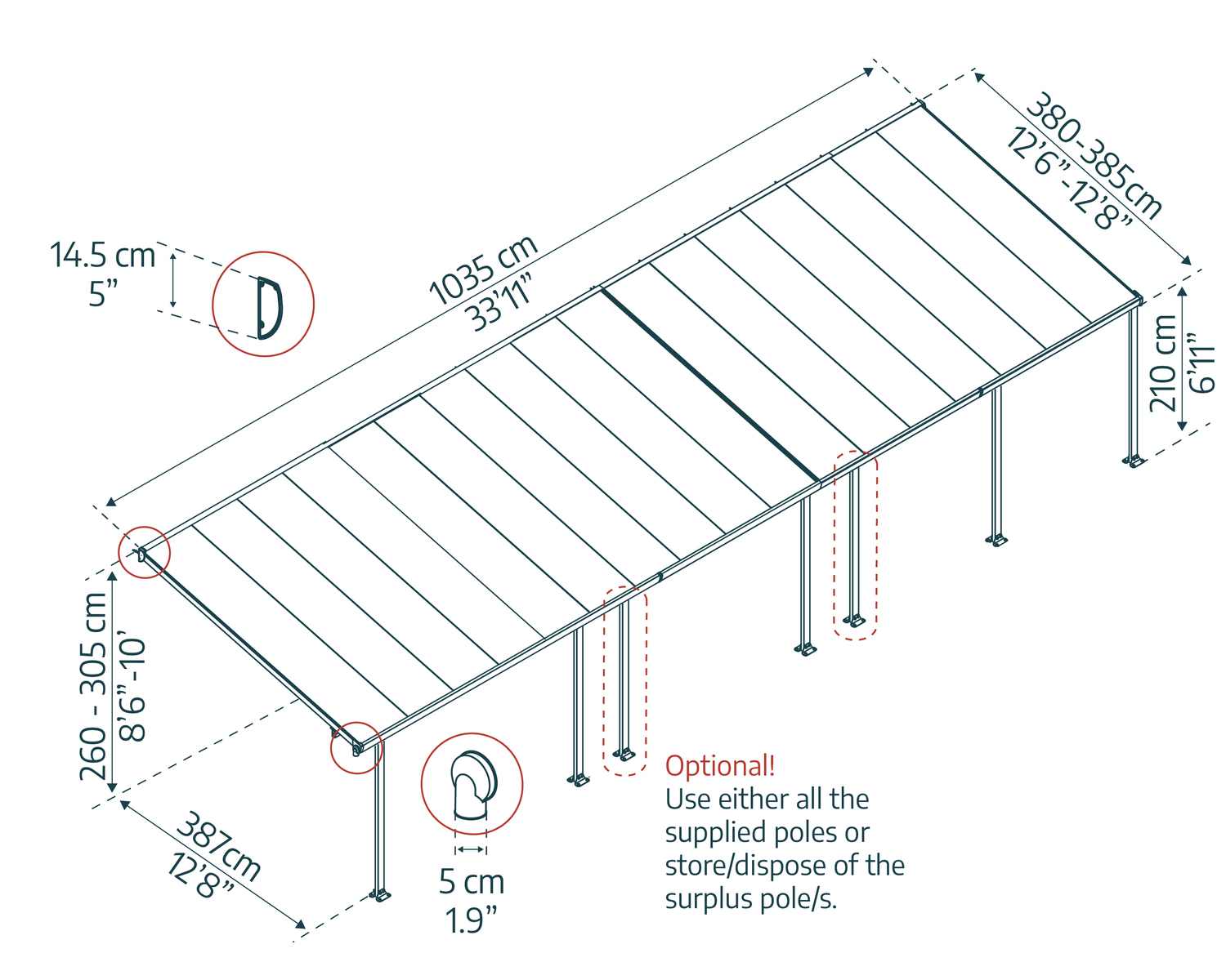 Genießen Sie warme Tage, kühle Nächte und alles zwischendurch unter der extrabreiten Feria-Terrassenüberdachung. Das Feria Terrassenüberdachungs-Bausatz ist eine attraktive, wartungsfreie Überdachungslösung für verschiedene Außenanwendungen wie z.B. eine Terrassenüberdachung, eine Sonnenlounge oder gar ein Carport. Schützen Sie Ihre Wertsachen vor dem unberechenbaren Wetter und den schädlichen UV-Strahlen mit dieser leistungsstarken Konstruktion. Sie verfügt über flexible positionierbare Pfosten, mit denen Sie die gewünschte Höhe am Wandanschluss, den Abstand zum Haus und zwischen den Pfosten an der Vorderseite einstellen können. Es wurde so konzipiert, dass es von 2 Personen einfach zusammengebaut werden kann. Dabei kommt das Click N‘ Lock-Dachsystem zum Einsatz, das eine sichere und einfache Montage ermöglicht und Undichtigkeiten verhindert. Es erfordert keine Erfahrung, keine besonderen Fähigkeiten und kein Spezialwerkzeug. Die Feria Übedachung bietet Ihrer Familie eine elegante, schön gestaltete, robuste Ergänzung zu Ihrem Außenbereich, die viele Jahre lang stabil und rostfrei bleibt.