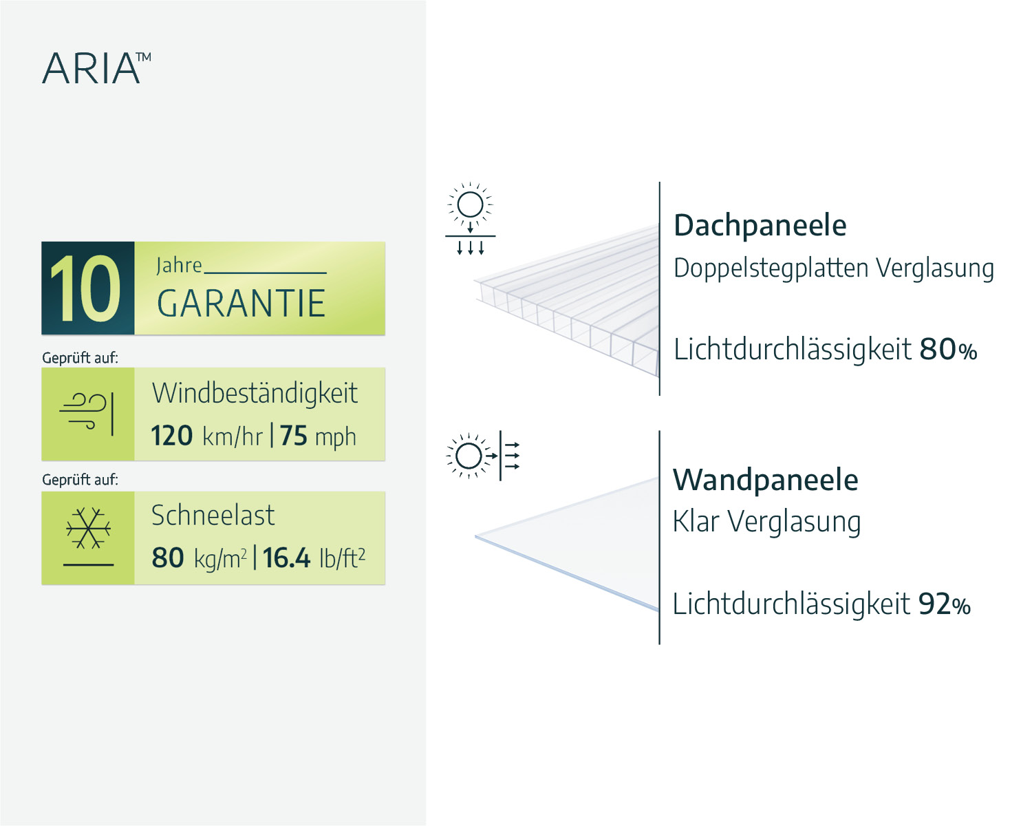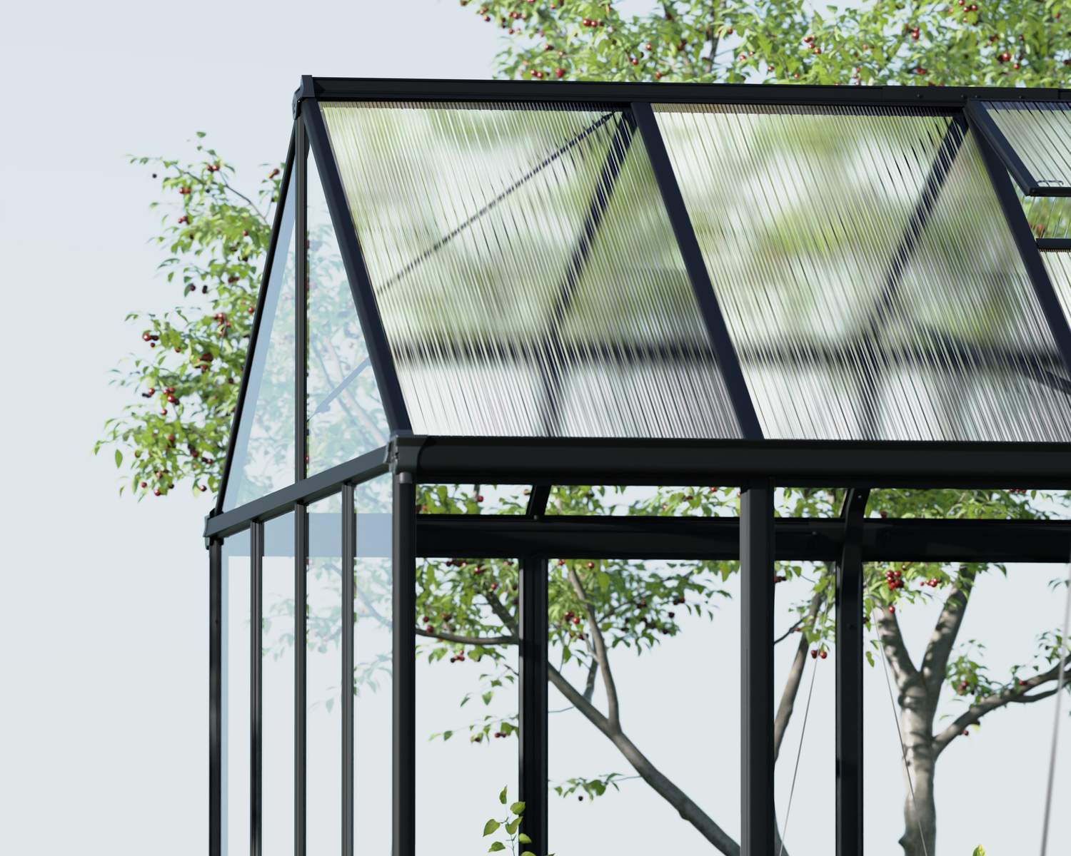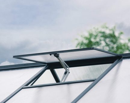 Mit seiner eleganten, klaren Optik und den kristallklaren Polycarbonatpaneelen lässt das Aria reichlich Sonnenlicht einfallen, schafft eine helle Atmosphäre und bietet Schutz für Pflanzen und Menschen