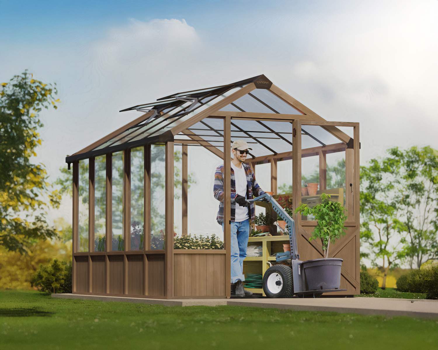 - Benutzerfreundliches Design: Eine breite, abschließbare Vordertür mit niedrigschwelliger Rampe ermöglicht den einfachen Zugang für Pflanzen, Gartengeräte oder Personen.