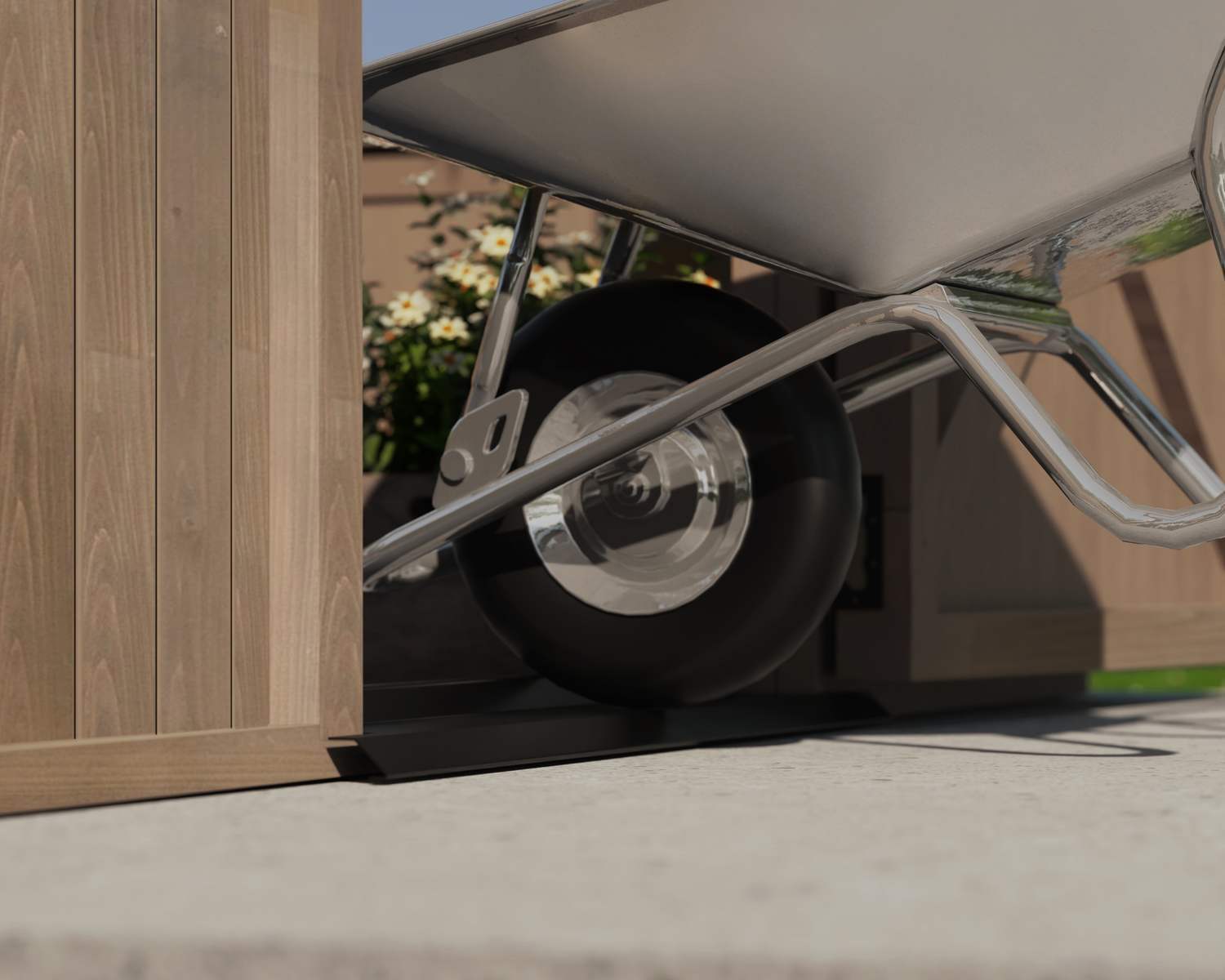 Eine breite, abschließbare Vordertür mit niedrigschwelliger Rampe ermöglicht den einfachen Zugang für Pflanzen, Gartengeräte oder Personen.