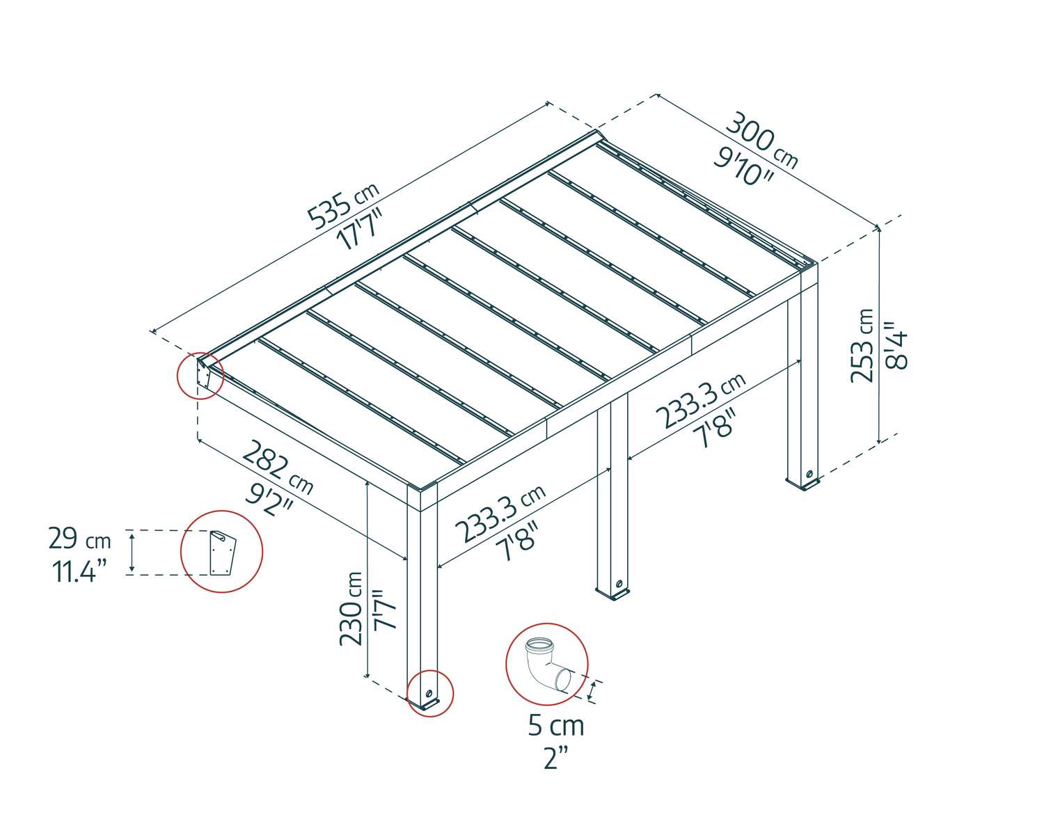 - Massive Struktur: Die beeindruckend große Terrassenüberdachung hat Pfosten mit den Maßen 23 x 18 cm und einer Höhe von 231 cm.