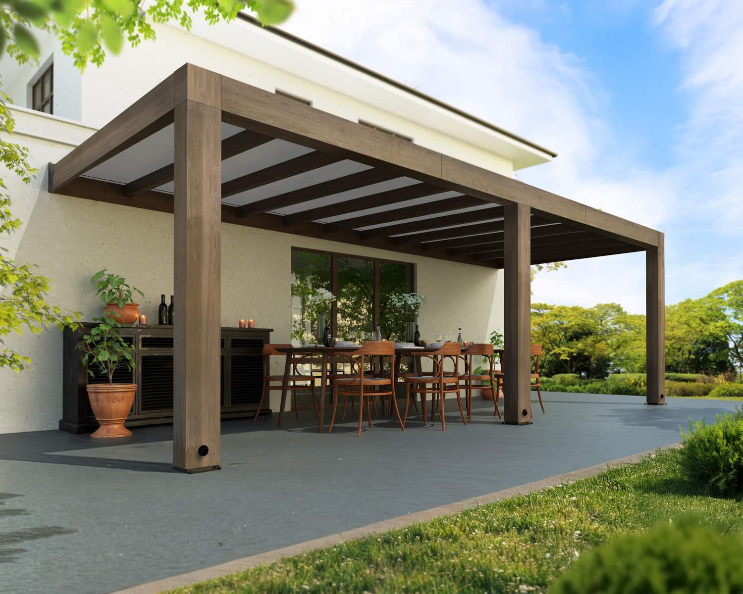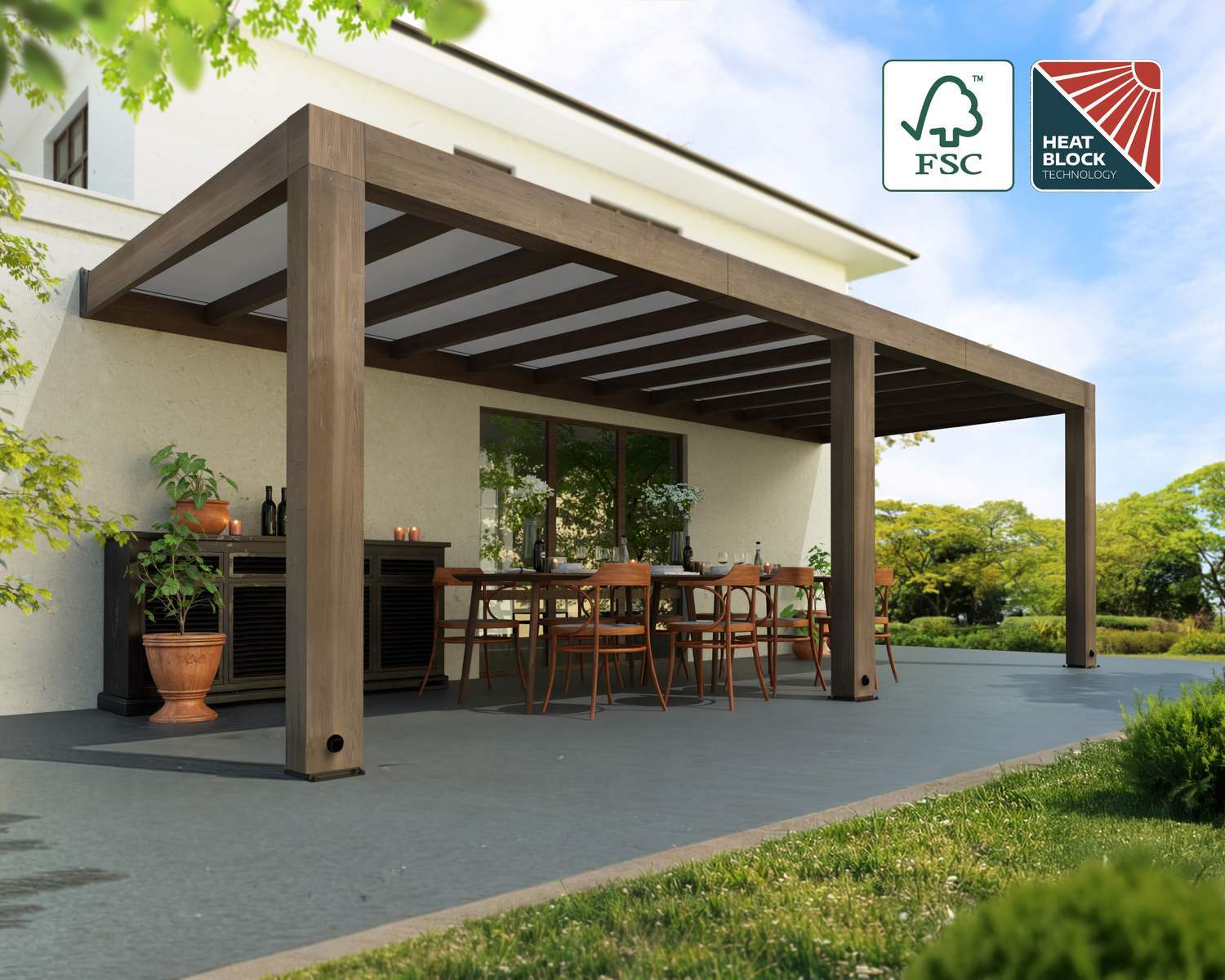 Die dem Zedernholz zugehörige Widerstandsfähigkeit gegen Fäulnis, Zersetzung und Schädlinge macht es zu einer ausgezeichneten Wahl für eine Terrassenüberdachung aus Holz. Die massive Struktur mit einem schlanken, minimalen Design verfügt über große Pfosten mit integrierten Dachrinnen und grauen Sun Control-Dachpaneelen, damit Sie das Sonnenlicht auf Ihrem Gesicht spüren und sich in der Wärme sonnen oder bei Regen im Trockenen sitzen können, denn das leckfreie System hält Sie geschützt.