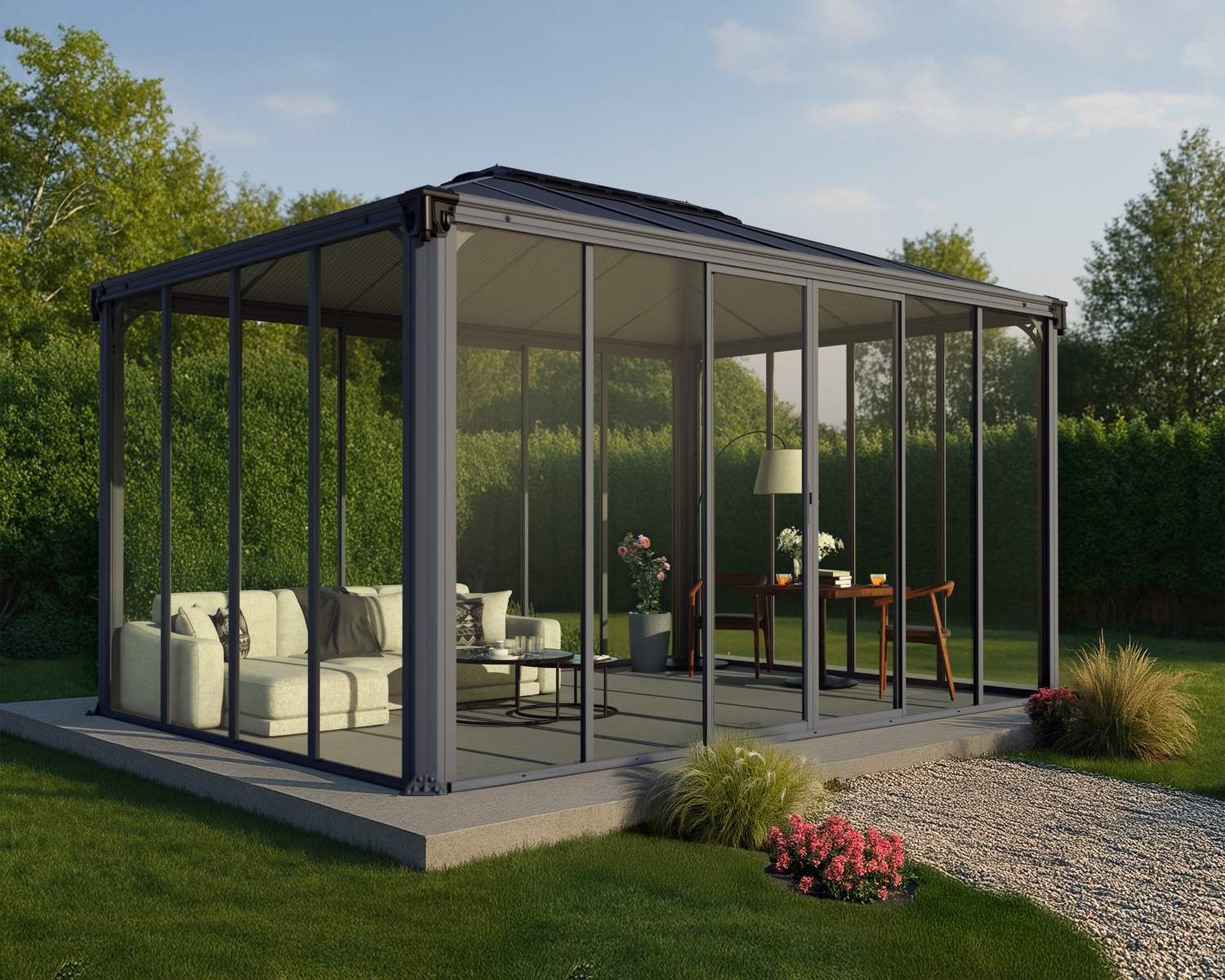 Nutzen Sie Ihren umschlossenen Pavillon als Essbereich im Innen- und Außenbereich, als Wintergarten, als einen besonderen Ort für kleine Feste mit Familie und Freunden, als Gartenbüro oder als überdachten Wellnessbereich. Dieser stilvolle Pavillon kann an einem Wochenende aufgebaut werden, so dass Ihnen noch immer genügend Zeit bleibt, sich zurücklehnen und Ihren neuen Lebensraum genießen zu können!