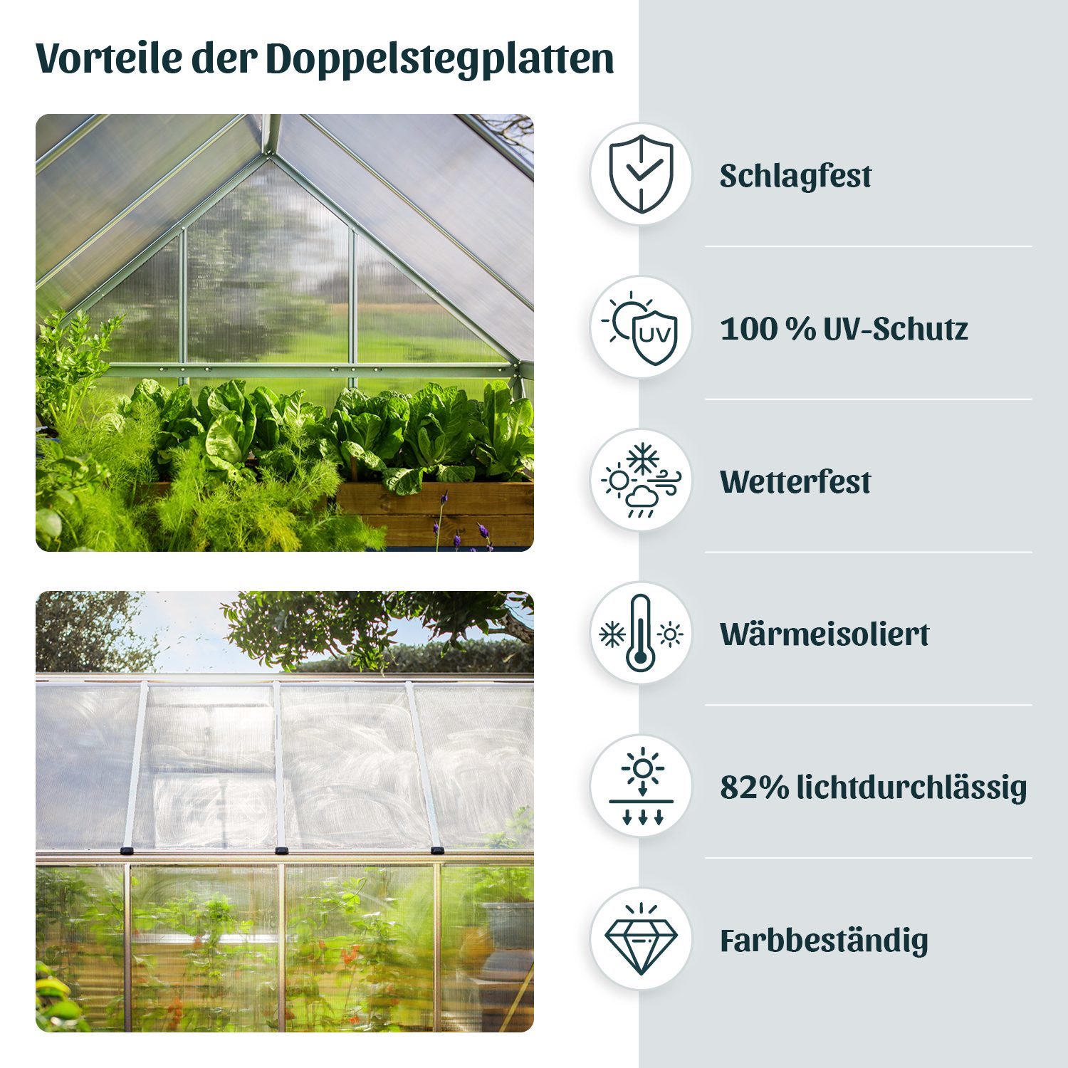 Der Gewächshausrahmen gewährleistet eine äußerst langlebige, rostfreie und besonders stabile Struktur. Aluminiumgestell Farboptionen: Silber - naturbelassen, Grau - RAL 7012, Grün - RAL 6005