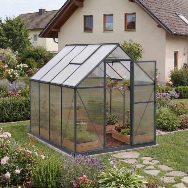 The Mythos Greenhouse helps you to maintain level temperatures and diffuse sunlight for sensitive plants. It is a sleekly designed greenhouse, featuring virtually unbreakable, twin–wall polycarbonate panels, and a heavy–duty, rust–resistant aluminum frame. The Mythos greenhouse is elegant and practical, perfectly designed to fit smaller spaces and protect your plants from the elements so you can start growing earlier and continue growing later.