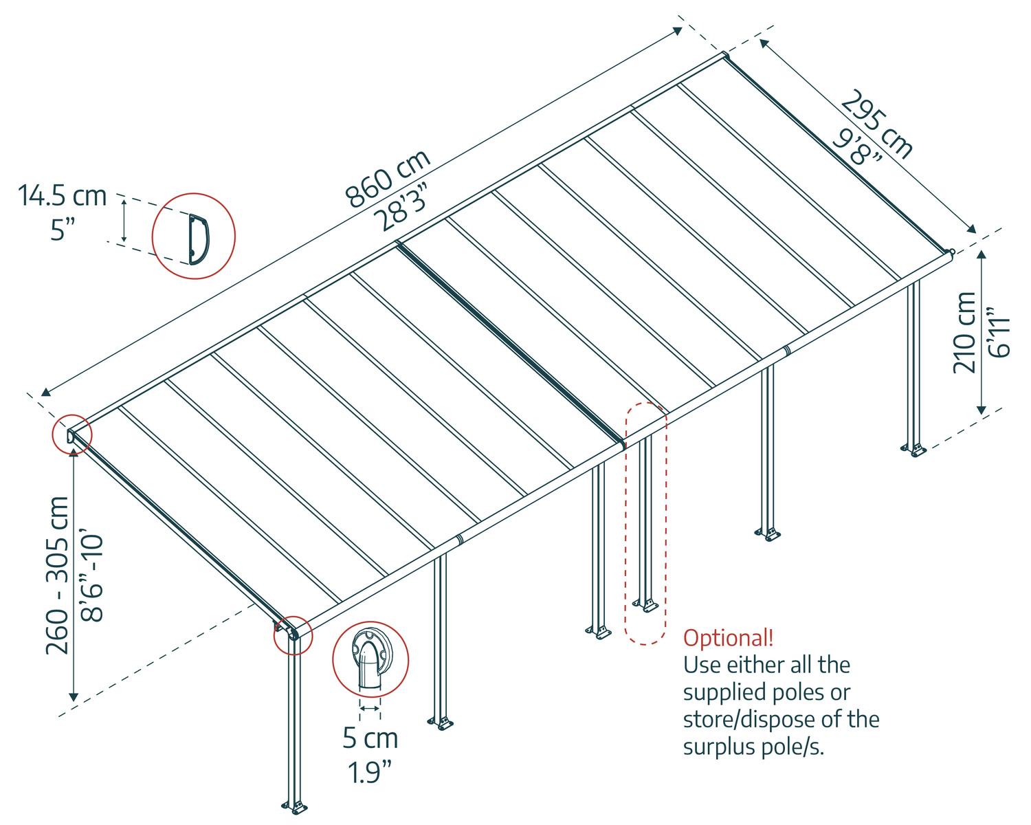 Ganz gleich, ob Sie einen Platz im Freien suchen, um Ihre Gäste zu bewirten, oder besondere Familienereignisse zu feiern oder um einfach nur in Ihrem Outdoor-Spa zu entspannen, die Olympia Terrassenüberdachung hat alles, was Sie brauchen. Sie bieten Ihnen den idealen Platz, um Ihren Garten zu genießen und sich am Ende des Tages zu entspannen. Die "Olympia" Modelles sind robust, stabil und langlebig. Sie bestehen aus einer hochbelastbaren, pulverbeschichteten, aus einer korrosionsbeständigen Aluminiumstruktur und aus praktisch unzerbrechlichen, 100% UV-geschützten, lichtstreuenden, mehrwandigen Polycarbonat-Dachpaneelen. Seien Sie kreativ mit Ihrem neuen luxuriösen Aufenthaltsbereich im Freien, nämlich im olympischen Stil; verleihen Sie Ihrem Garten etwas zusätzlichen Glanz und verwandeln Sie Ihren Außenbereich in eine elegante Ergänzung Ihres Hauses und Ihres Lebensstils, die Sie das ganze Jahr über genießen können.