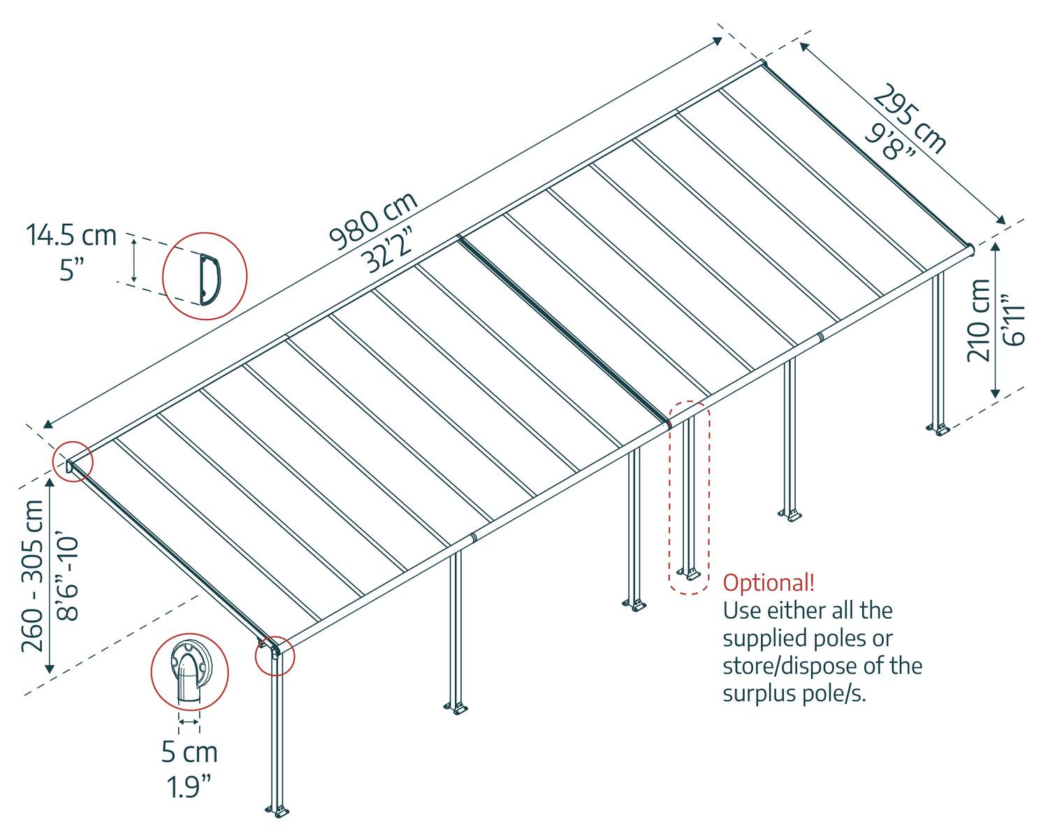 Ganz gleich, ob Sie einen Platz im Freien suchen, um Ihre Gäste zu bewirten, oder besondere Familienereignisse zu feiern oder um einfach nur in Ihrem Outdoor-Spa zu entspannen, die Olympia Terrassenüberdachung hat alles, was Sie brauchen. Sie bieten Ihnen den idealen Platz, um Ihren Garten zu genießen und sich am Ende des Tages zu entspannen. Die "Olympia" Modelles sind robust, stabil und langlebig. Sie bestehen aus einer hochbelastbaren, pulverbeschichteten, aus einer korrosionsbeständigen Aluminiumstruktur und aus praktisch unzerbrechlichen, 100% UV-geschützten, lichtstreuenden, mehrwandigen Polycarbonat-Dachpaneelen. Seien Sie kreativ mit Ihrem neuen luxuriösen Aufenthaltsbereich im Freien, nämlich im olympischen Stil; verleihen Sie Ihrem Garten etwas zusätzlichen Glanz und verwandeln Sie Ihren Außenbereich in eine elegante Ergänzung Ihres Hauses und Ihres Lebensstils, die Sie das ganze Jahr über genießen können.