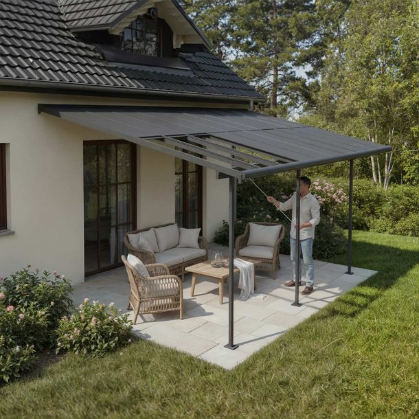 - Modernes Design : Außergewöhnlich flexibel – Sonne oder Schatten ganz nach Wunsch. Das Dach mit verschiebbaren Paneelen überzeugt durch klare Linien und ein elegantes Erscheinungsbild, das die Optik Ihres Hauses aufwertet.