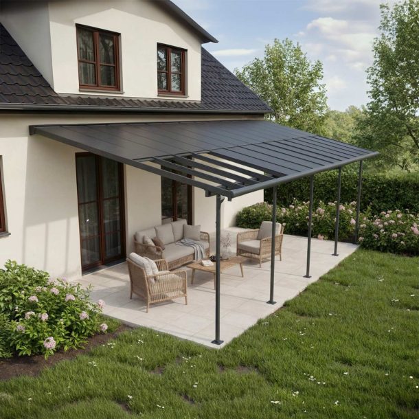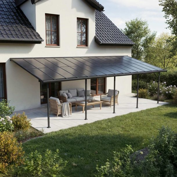 • Resilient Panels: The 6 mm matte opaque grey roof panels have full shade glazing with „Heat Block Technology“, preventing the sun’s rays from shining through making it cooler and protecting your outdoor space. Canopia polycarbonate panels are 100% UV protected, ensuring they do not turn yellow or become brittle over time.
