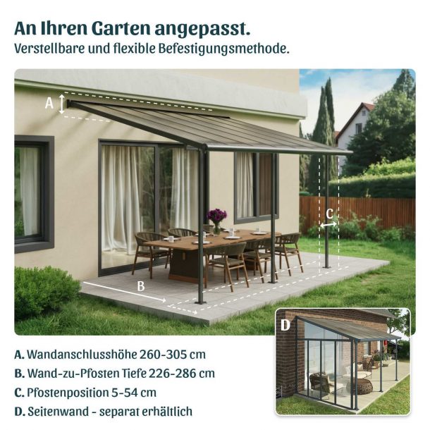 Erfordert einen festen, ebenen Untergrund und eine solide Wandhalterung. Inklusive Verankerung. Befestigen Sie die Terrassenüberdachung auf dem Untergrund Ihrer Wahl, um Ihre robuste Struktur optimal zu nutzen, ihre Stabilität zu erhöhen und ihre Wetterbeständigkeit zu verbessern. Stabile, ovale Aluminiumstangen.