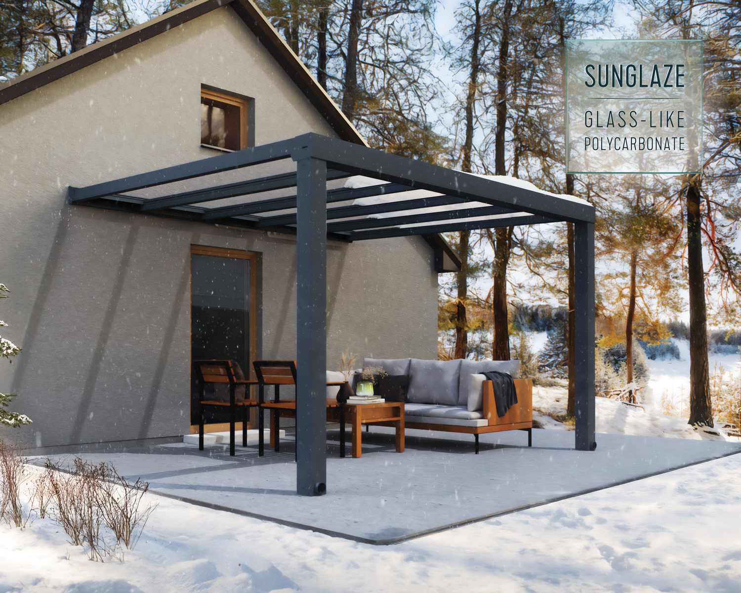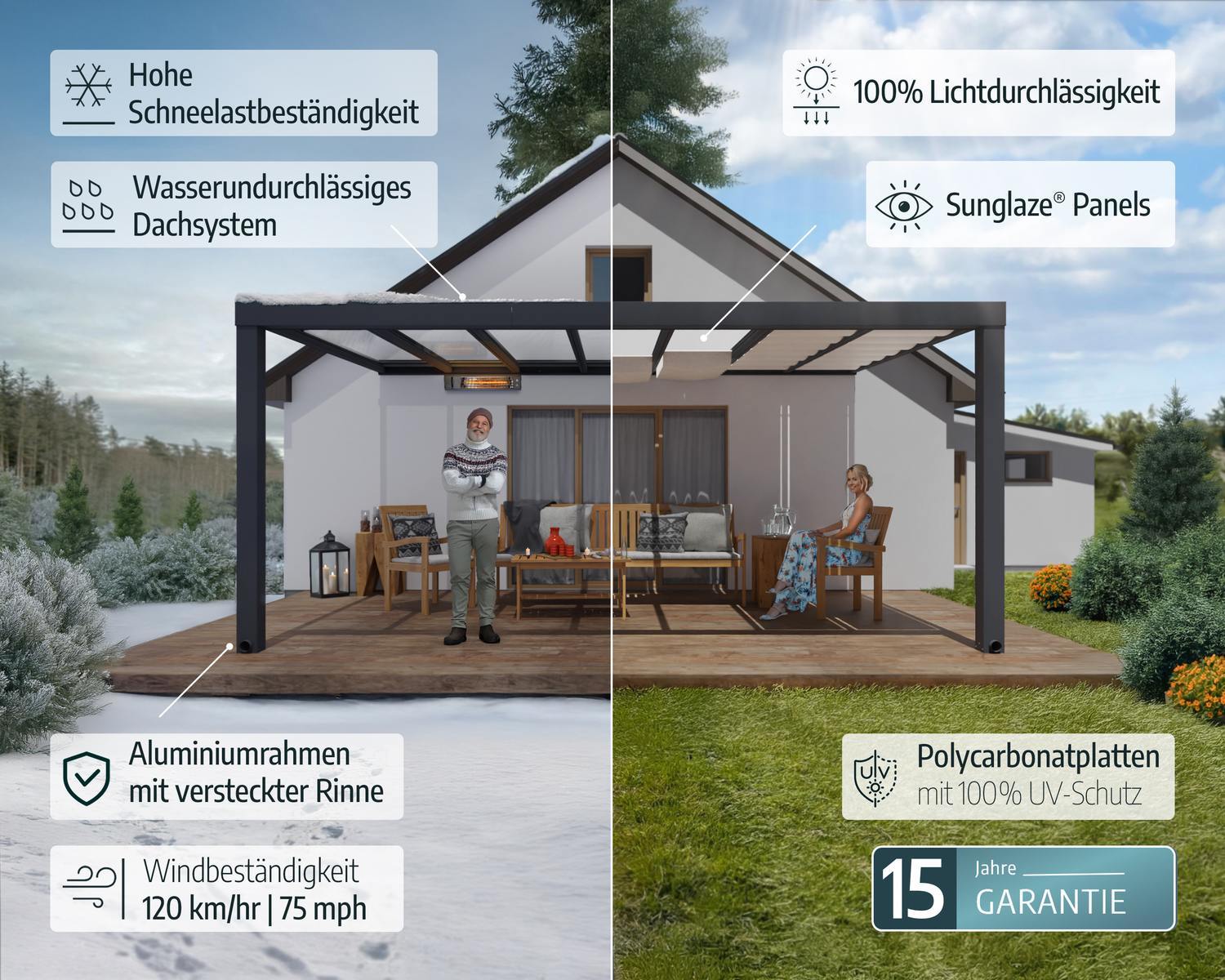Setzen Sie ein Zeichen mit der massiven und eleganten Stockholm Terrassenüberdachung. Die Stockholm Terrassenmarkise hat ein klares Design, das Ihnen einen eleganten Lebensraum bietet, in dem Sie die Natur genießen können und gleichzeitig vor den Elementen geschützt sind. Die kristallklaren Paneele bestehen aus Polycarbonat, einem nahezu unzerbrechlichen High-End-Polymer, das eine 100-prozentige Lichtdurchlässigkeit und alle Vorteile von Glas bietet, ohne die damit verbundenen Nachteile, was sie besonders sicher macht. Sie sind hoch belastbar, witterungs- und UV-beständig und gewährleisten so über Jahre hinweg Stärke und Qualität. Diese moderne Markise ist so konzipiert, dass sie das ganze Jahr über genutzt werden kann. So können Sie mehr Zeit damit verbringen, sich zu entspannen, im Freien zu speisen, Feste und Veranstaltungen zu feiern oder einfach nur die Aussicht auf Ihren Garten zu genießen. Verschönern Sie Ihr Haus und Ihren Garten an einem Wochenende und genießen Sie jahrelang die Aussicht.
