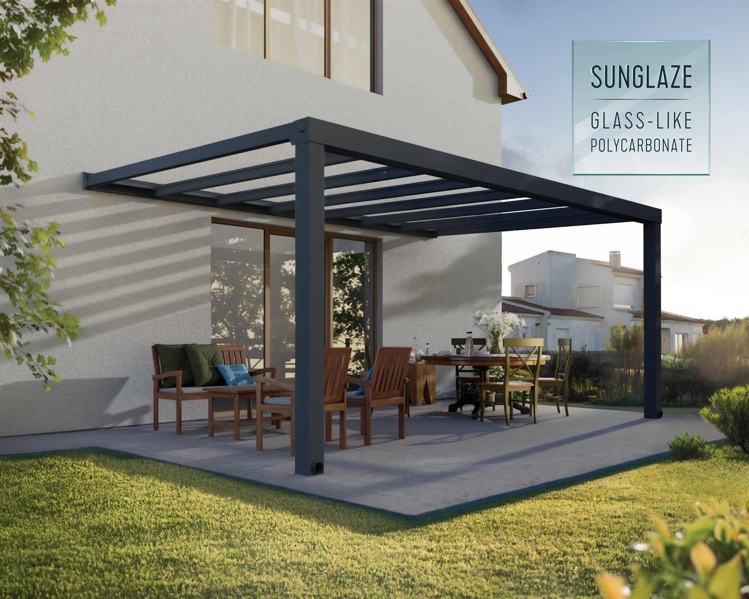 Setzen Sie ein Zeichen mit der massiven und eleganten Stockholm Terrassenüberdachung. Die Stockholm Terrassenmarkise hat ein klares Design, das Ihnen einen eleganten Lebensraum bietet, in dem Sie die Natur genießen können und gleichzeitig vor den Elementen geschützt sind. Die kristallklaren Paneele bestehen aus Polycarbonat, einem nahezu unzerbrechlichen High-End-Polymer, das eine 100-prozentige Lichtdurchlässigkeit und alle Vorteile von Glas bietet, ohne die damit verbundenen Nachteile, was sie besonders sicher macht. Sie sind hoch belastbar, witterungs- und UV-beständig und gewährleisten so über Jahre hinweg Stärke und Qualität. Diese moderne Markise ist so konzipiert, dass sie das ganze Jahr über genutzt werden kann. So können Sie mehr Zeit damit verbringen, sich zu entspannen, im Freien zu speisen, Feste und Veranstaltungen zu feiern oder einfach nur die Aussicht auf Ihren Garten zu genießen. Verschönern Sie Ihr Haus und Ihren Garten an einem Wochenende und genießen Sie jahrelang die Aussicht.