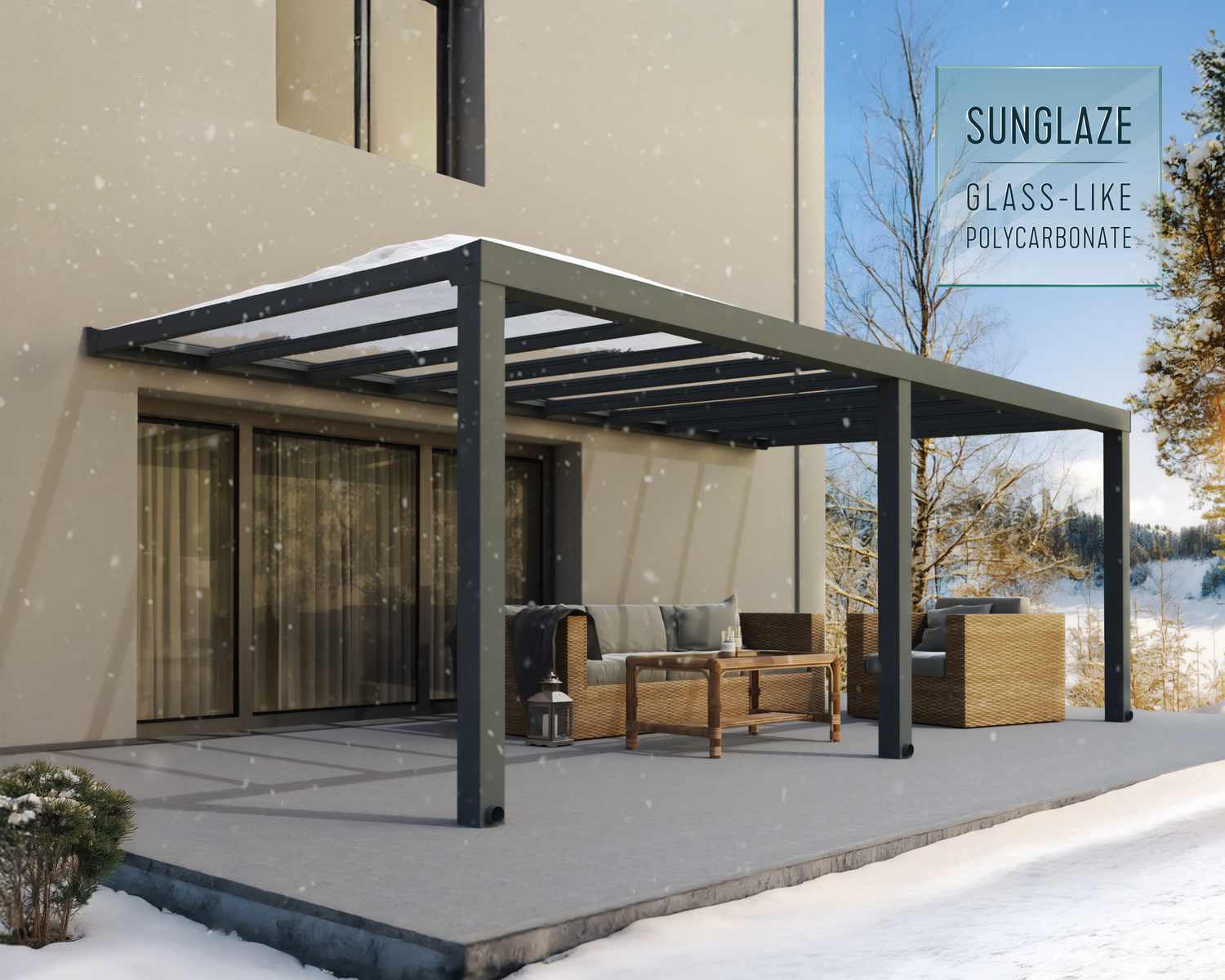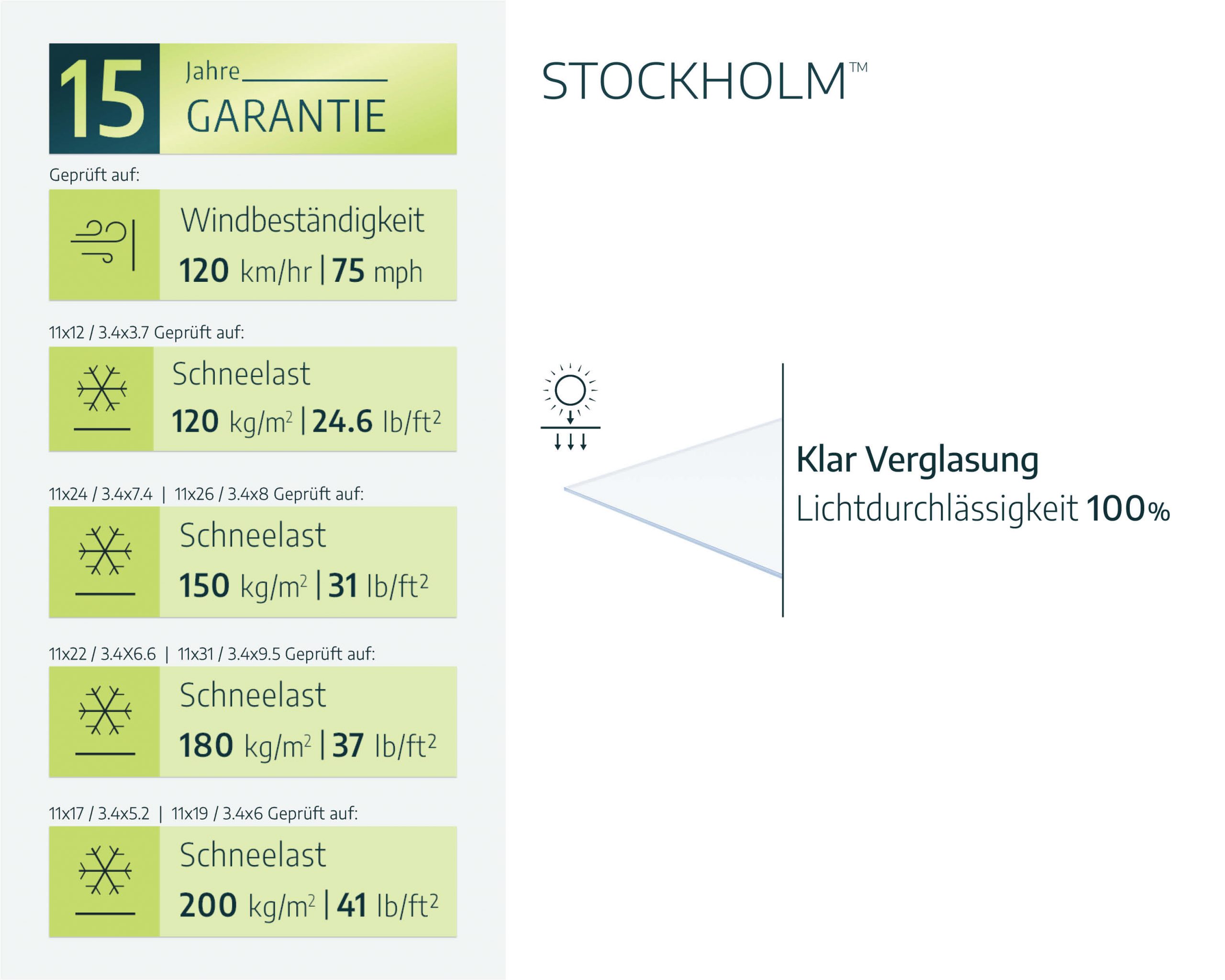 Setzen Sie ein Zeichen mit der massiven und eleganten Stockholm Terrassenüberdachung. Die Stockholm Terrassenmarkise hat ein klares Design, das Ihnen einen eleganten Lebensraum bietet, in dem Sie die Natur genießen können und gleichzeitig vor den Elementen geschützt sind. Die kristallklaren Paneele bestehen aus Polycarbonat, einem nahezu unzerbrechlichen High-End-Polymer, das eine 100-prozentige Lichtdurchlässigkeit und alle Vorteile von Glas bietet, ohne die damit verbundenen Nachteile, was sie besonders sicher macht. Sie sind hoch belastbar, witterungs- und UV-beständig und gewährleisten so über Jahre hinweg Stärke und Qualität. Diese moderne Markise ist so konzipiert, dass sie das ganze Jahr über genutzt werden kann. So können Sie mehr Zeit damit verbringen, sich zu entspannen, im Freien zu speisen, Feste und Veranstaltungen zu feiern oder einfach nur die Aussicht auf Ihren Garten zu genießen. Verschönern Sie Ihr Haus und Ihren Garten an einem Wochenende und genießen Sie jahrelang die Aussicht.
