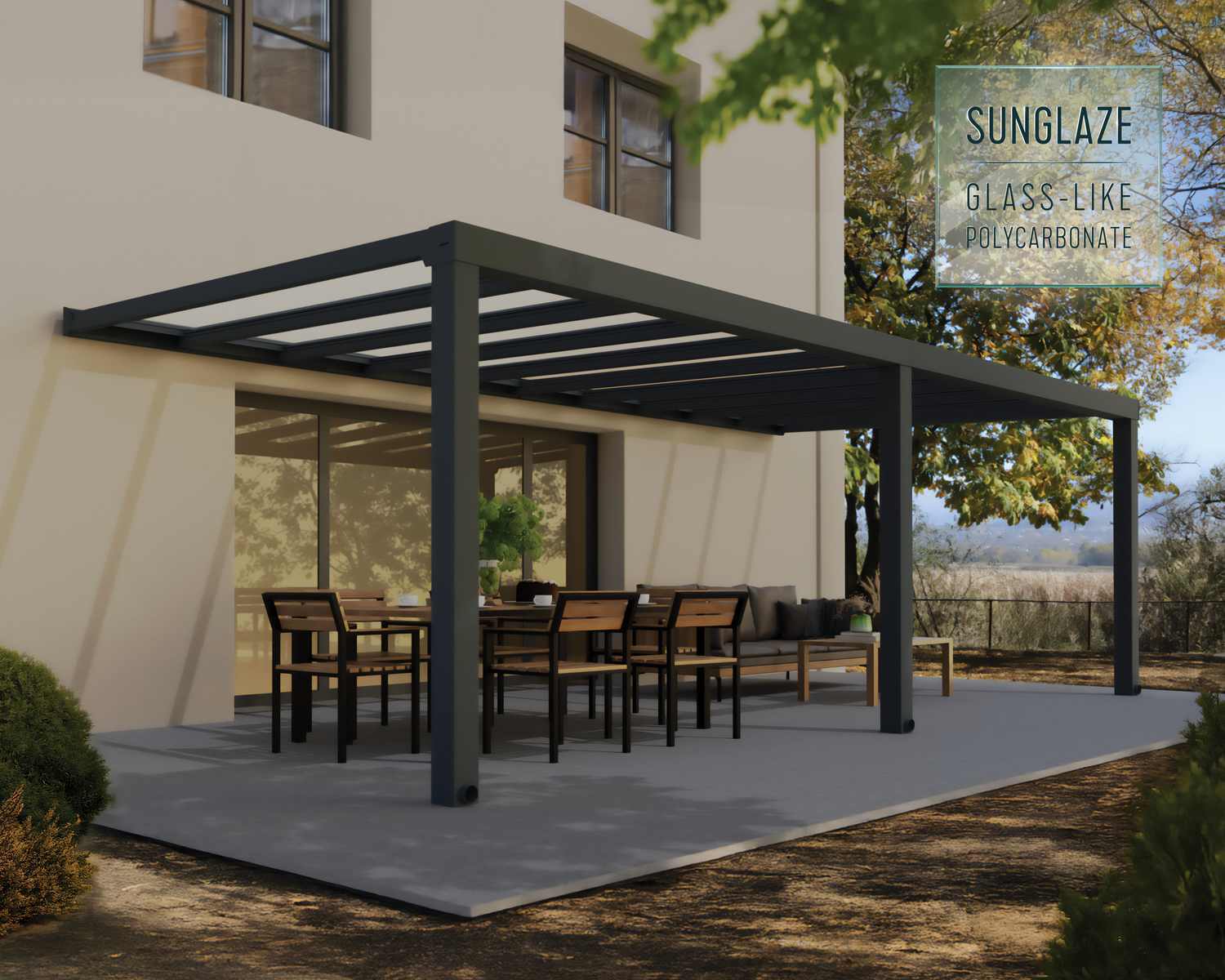 Setzen Sie ein Zeichen mit der massiven und eleganten Stockholm Terrassenüberdachung. Die Stockholm Terrassenmarkise hat ein klares Design, das Ihnen einen eleganten Lebensraum bietet, in dem Sie die Natur genießen können und gleichzeitig vor den Elementen geschützt sind. Die kristallklaren Paneele bestehen aus Polycarbonat, einem nahezu unzerbrechlichen High-End-Polymer, das eine 100-prozentige Lichtdurchlässigkeit und alle Vorteile von Glas bietet, ohne die damit verbundenen Nachteile, was sie besonders sicher macht. Sie sind hoch belastbar, witterungs- und UV-beständig und gewährleisten so über Jahre hinweg Stärke und Qualität. Diese moderne Markise ist so konzipiert, dass sie das ganze Jahr über genutzt werden kann. So können Sie mehr Zeit damit verbringen, sich zu entspannen, im Freien zu speisen, Feste und Veranstaltungen zu feiern oder einfach nur die Aussicht auf Ihren Garten zu genießen. Verschönern Sie Ihr Haus und Ihren Garten an einem Wochenende und genießen Sie jahrelang die Aussicht.