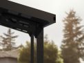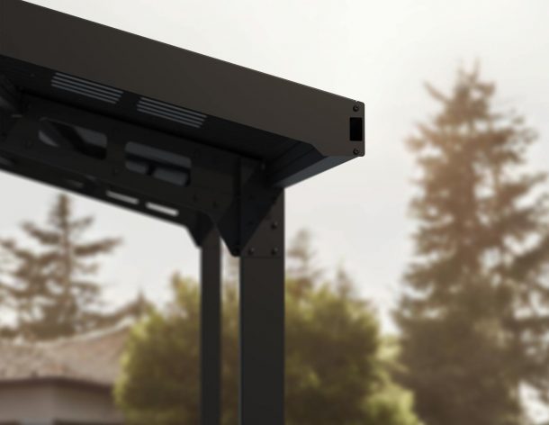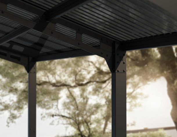 Der Aluminiumrahmen ist ein starkes, rostbeständiges, schwarz beschichtetes Metall und verfügt über integrierte Regenrinnen zur Ableitung von Regenwasser.