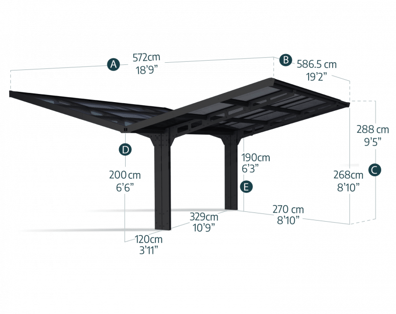 Der Sydney freitragende Carport gibt Ihnen die Freiheit, ohne zusätzliche Pfosten zu parken. Ideal für Wendeplätze oder Autoladestationen sind freitragende Carports eine großartige Möglichkeit, Ihr Fahrzeug zu schützen und gleichzeitig wenig Platz zu beanspruchen. Der vielseitige Carport-Bausatz ist mit Paneelen ausgestattet, die das Sonnenlicht durchlassen und gleichzeitig UV-Schutz und ausreichend Schatten bieten, so dass er als Flachdach-Carport, Terrassenüberdachung oder überdachter Aufenthaltsbereich im Freien genutzt werden kann. Mit einer Breite von fast 3 Metern und einer Länge von 6 Metern ist diese zweibeinige Autoüberdachung so konstruiert, dass sie unbeständigen Wetterbedingungen standhält. Der extrem widerstandsfähige Carport aus Polycarbonat verfügt über ein eingebautes Rinnensystem, das die Ableitung und Sammlung von Wasser für ein nachhaltiges Bewässerungssystem ermöglicht. Der Vorteil des einzigartigen Designs ist, dass der Sydney als Doppelcarport in Scheitel- oder Flügelform installiert werden kann. Schützen Sie Ihr Fahrzeug vor Schnee, Hagel, Wind und UV-Strahlung in einem modernen und vielseitigen Carport.