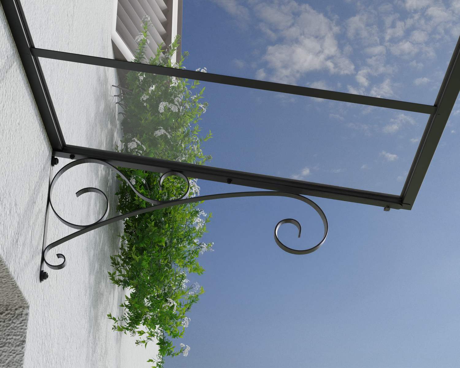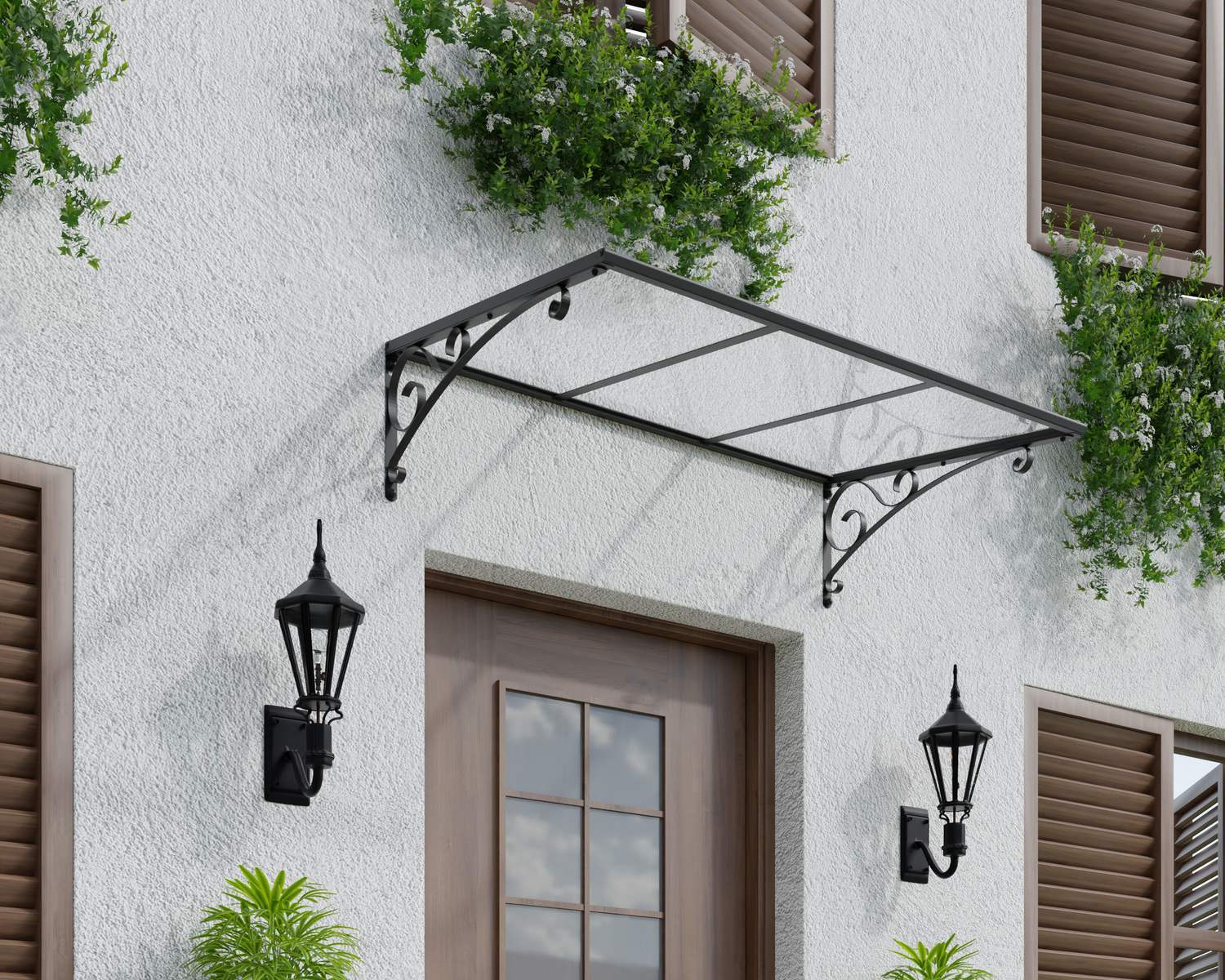 Das Türvordach Venus ist die perfekte Kombination des Modernen und des Retrostils. Mit Polycarbonatpaneelen und einem Aluminiumrahmen, die eine flache Abdeckung formieren, erhalten Sie eine hervorragende Funktionalität, während die stählernen Halterungen des Vordachs einen Hauch von Jugendstil vermitteln. Dieses sowohl robuste als auch attraktive Türvordach verschönert das Erscheinungsbild und die Funktionalität der Außenseite Ihres Hauses. Das Retro Türvordach schützt Sie, Ihre Tür, Ihren Eingangsbereich und alles, was sich darunter befindet. Dieses ultra-robuste Vordach ist einfach zu montieren und so konzipiert, dass es auch rauen Witterungsverhältnissen standhält, damit Sie, Ihre Sachen und Ihre Tür über Jahre hinweg geschützt sind. Mit dem Türvordach Venus erhalten Sie den Schutz, und das Erscheinungsbild, das Sie sich wünschen.